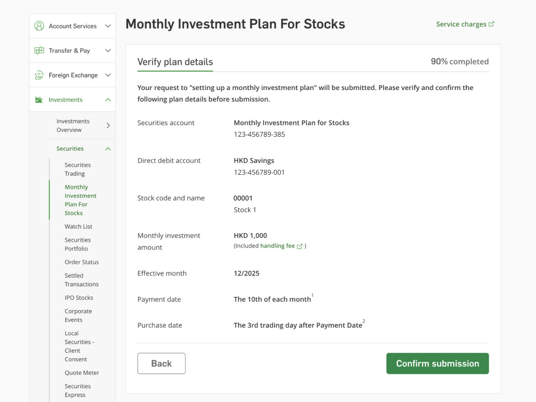 Sole-named Integrated Account holders can open an account for Monthly Investment Plan for Stocks and set up a new plan via Personal e-Banking. The new plan will be effective from the next calendar month following the month you set up the new plan, with the 1st payment date scheduled for the 10th of such following calendar month. If the 10th falls on a Saturday, Sunday or public holiday, the payment will occur on the next trading day.