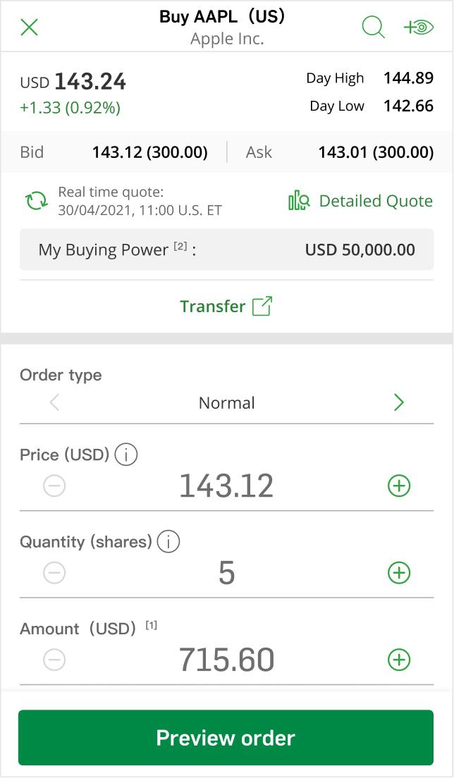 The current average reference price of an S&P 500 constituent stock is USD50.00 during market hours. If you want to place a market order of 10 shares of this stock, we’ll calculate the "hold amount" as USD525.00 (Limit up price is USD50.00 x 105% = USD52.50) and you should ensure that you have sufficient funds in your settlement account to settle the order after it is executed.