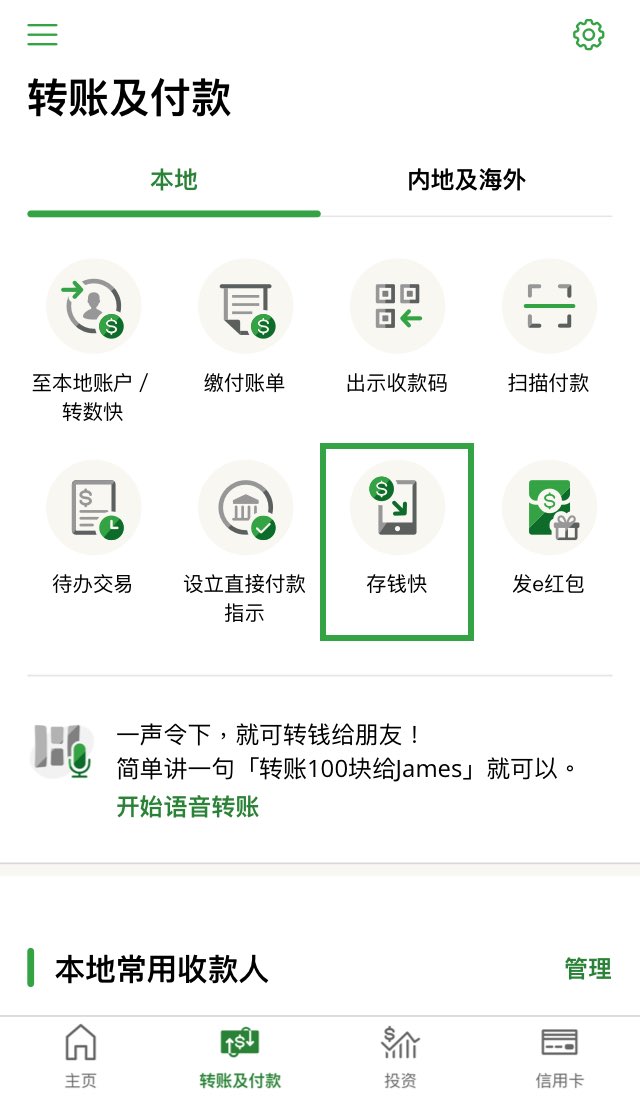 登入恒生Mobile App后,点按“转账及付款”> “本地”分页> “存钱快”。