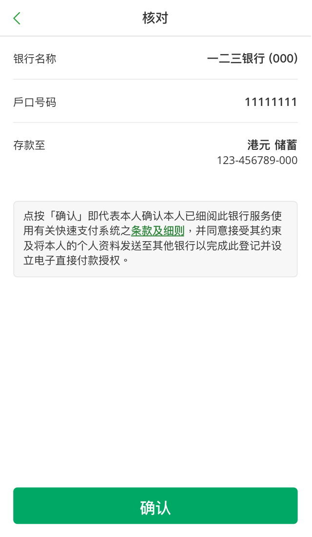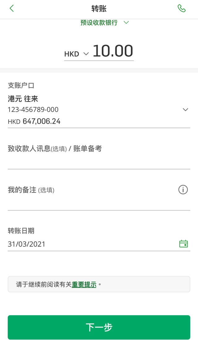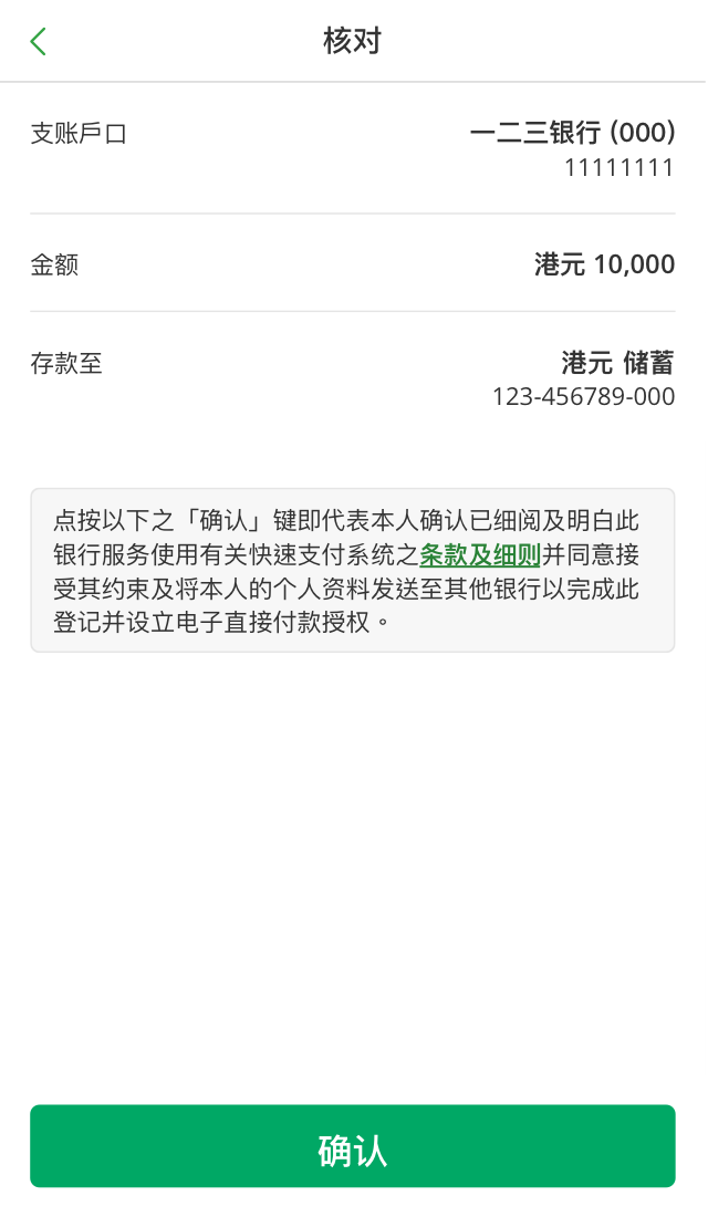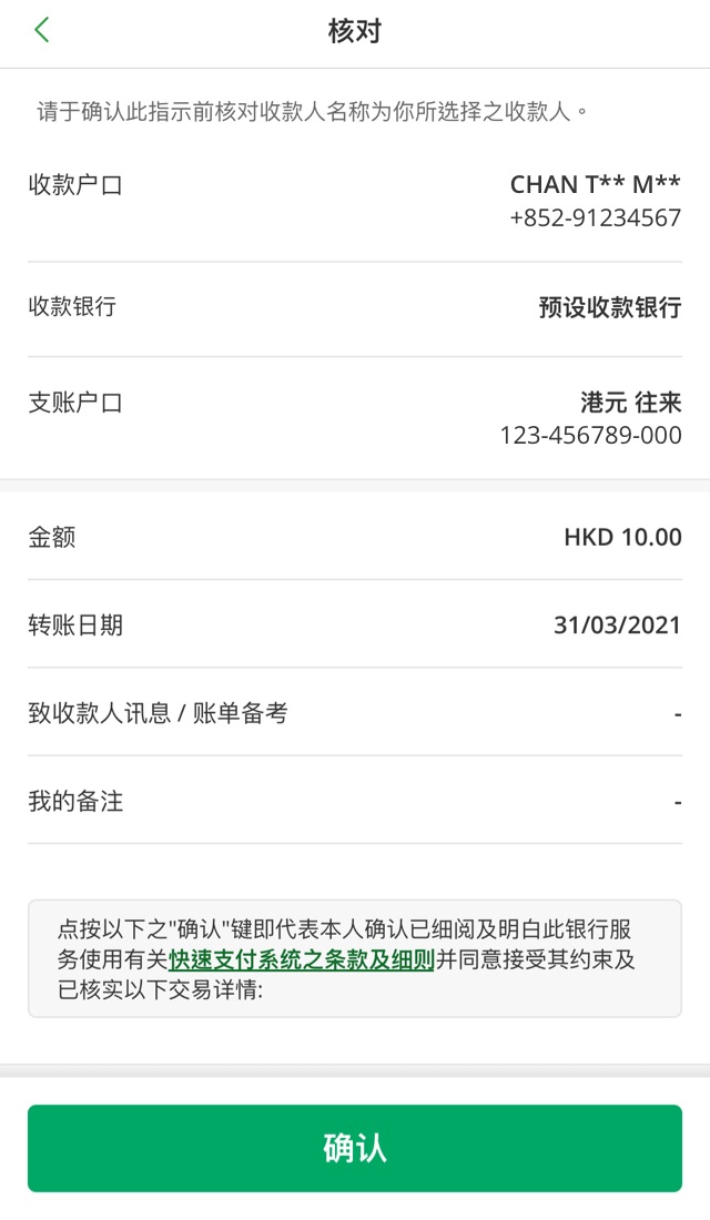 转数快转账生效后,你将无法停止指示。因此通过转数快进行转账时,请仔细核对收款人姓名和户口号码等付款详情。