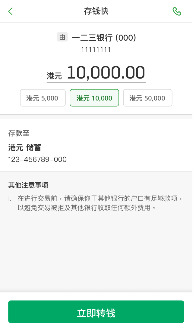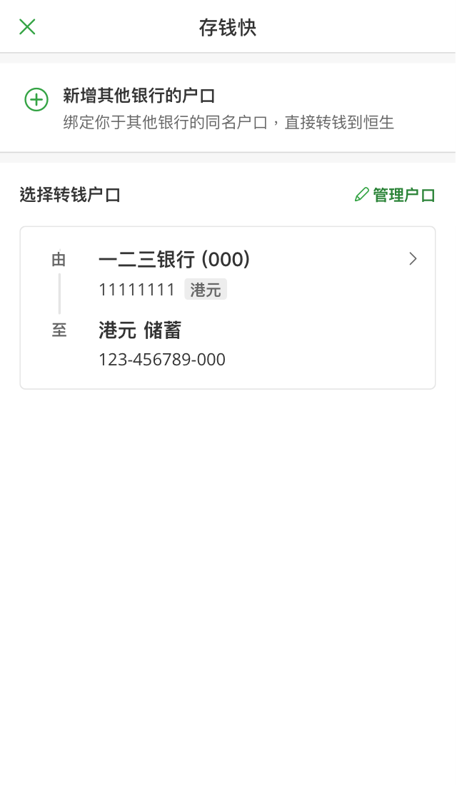 • 透过“存钱快”,无需再切换其他银行应用程式即可将钱转入你的恒生银行户口