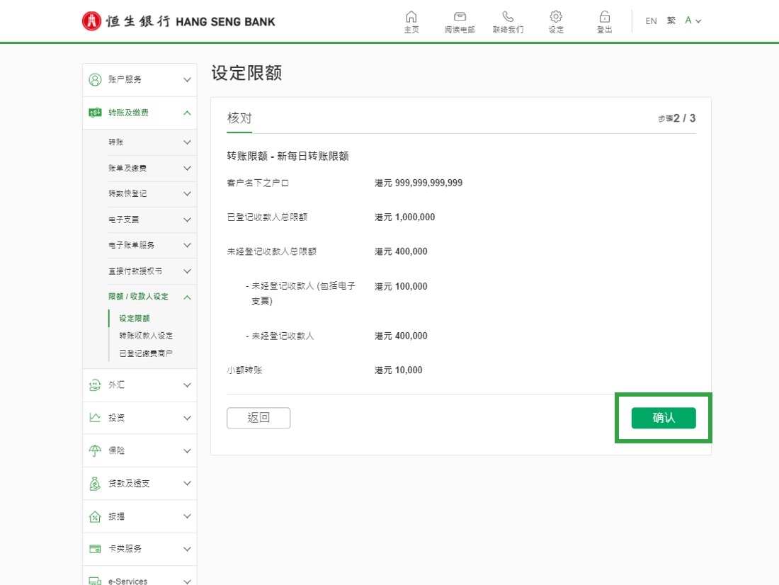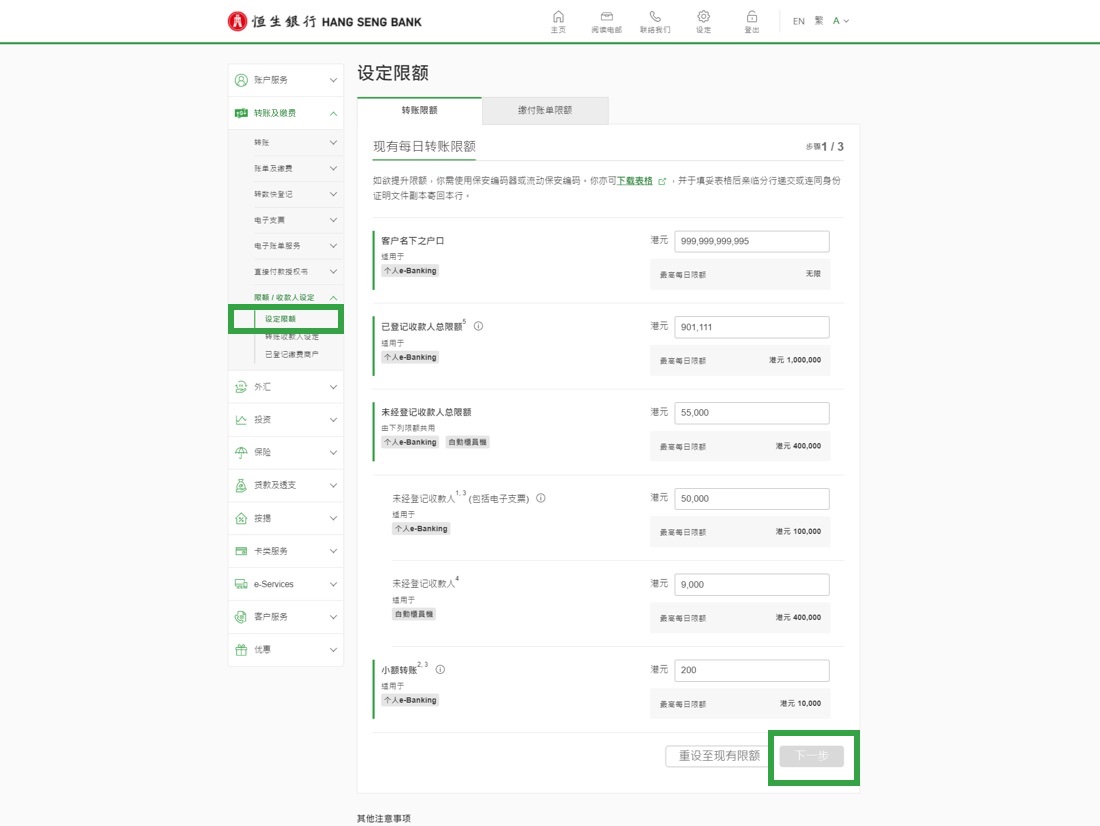• 或于左方选单点按“转账及缴费” “限额 / 收款人设定” “设定限额”