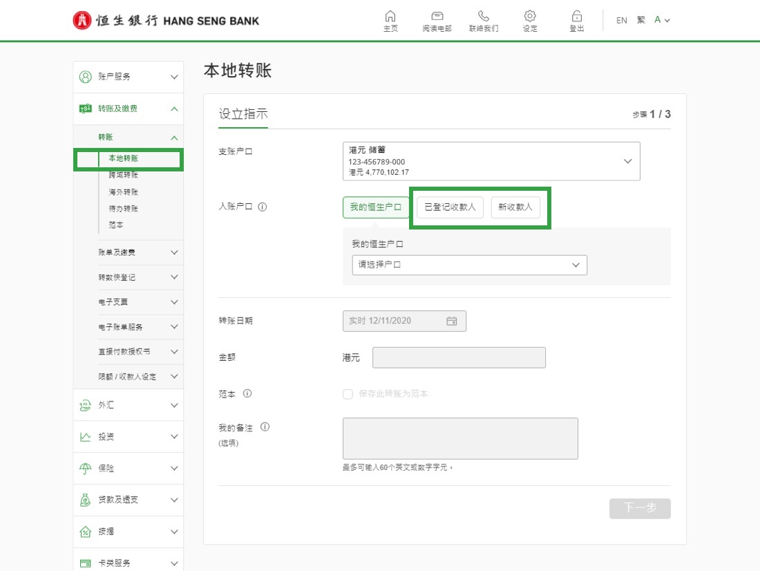 • 转账至其他人开立的恒生账户