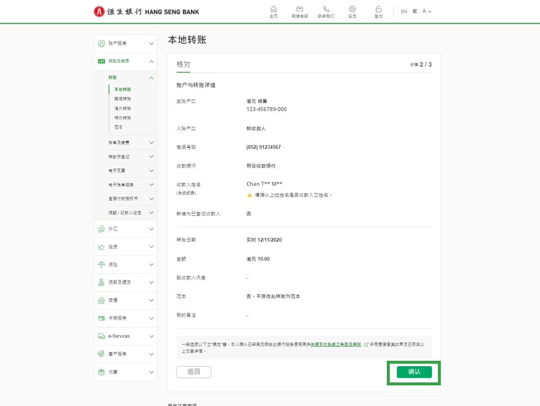 • 转账至你名下的恒生账户