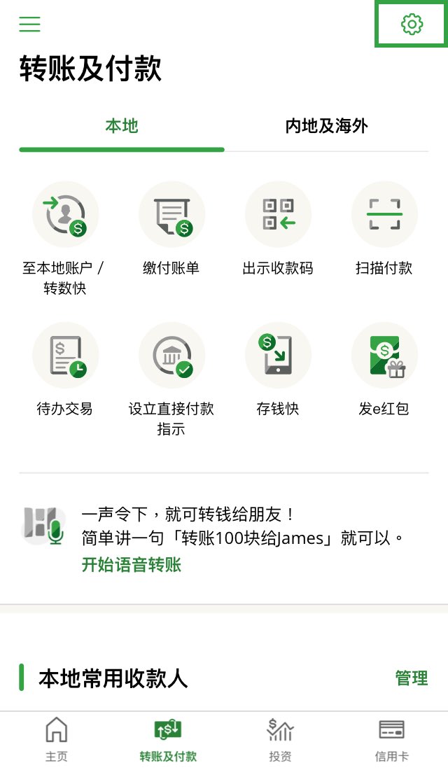你可经网站登入个人e-Banking > “设定” >“ 转账及缴费”下的“设定限额”,或在恒生Mobile App的“转账及付款”页面点按右上角的的齿轮图标前往设定,选择 “设置转账及付款限额”更新每日转账限额。