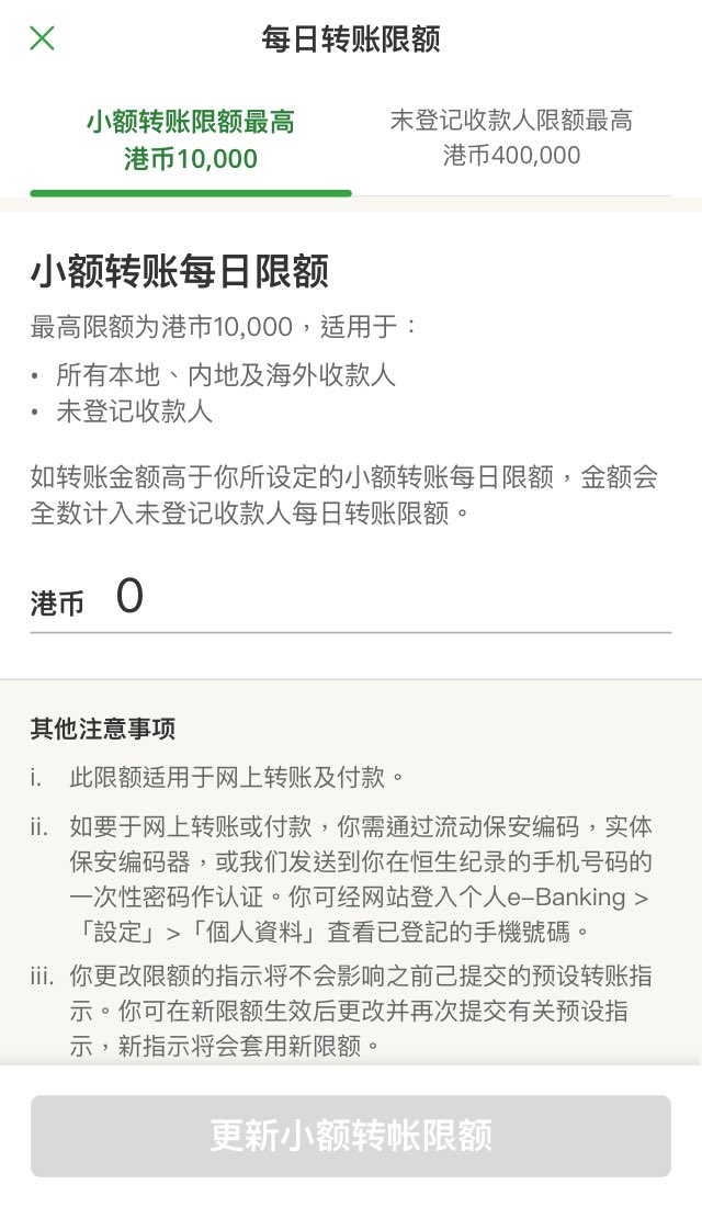 • 转账至新收款人的预设转账限额为零。客户如欲于网上设立或增加转账限额,须进行双重认证