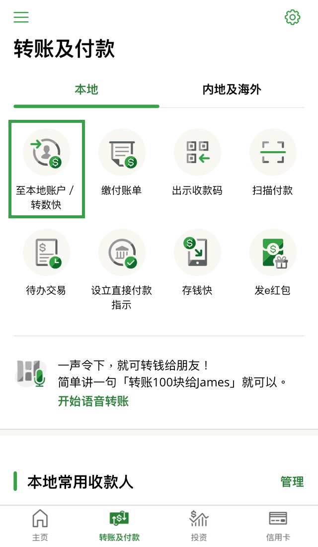 请注意,用以上任何一种转账方法转账至你本港其他银行账户,收款银行可能收取服务费用。个人e-Banking支持转账至快速支付系统(“转数快”)的参与机构。