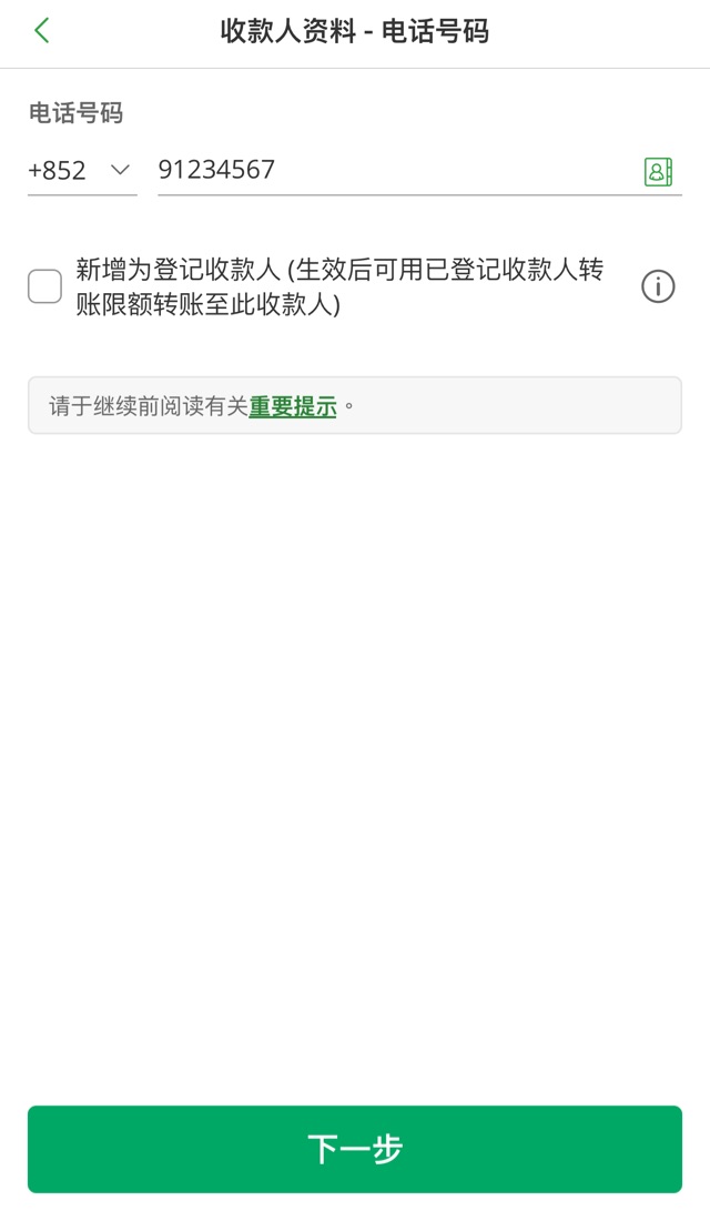 如需要转账至新收款人,你必须于本行登记有效的电话号码,并已设定未经登记收款人或小额转账之每日转账限额,如使用未经登记收款人之每日转账限额,你亦需要先启动保安编码器或流动保安编码作交易认证。如收款银行是"转数快"参与者之一,通常可以即时接收款项,但仍需视乎收款银行之运行模式。