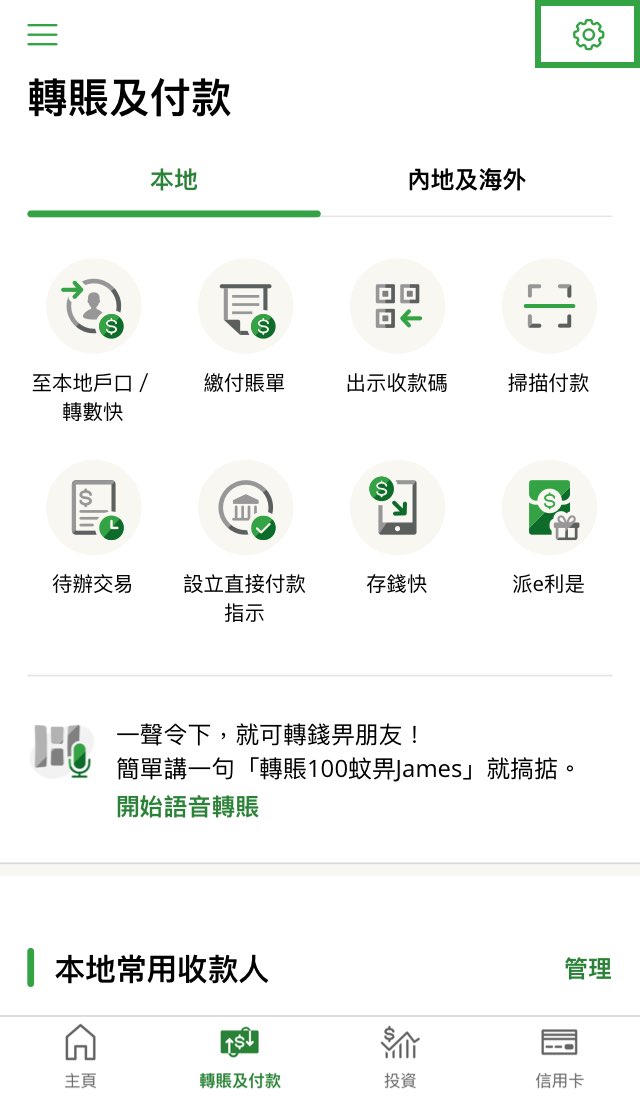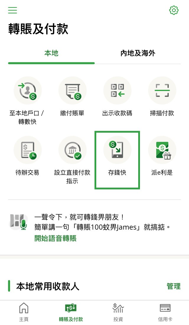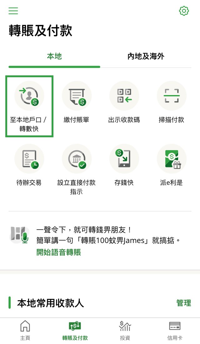 1. 在「轉賬及付款」頁面,選擇「至本地戶口/轉數快」