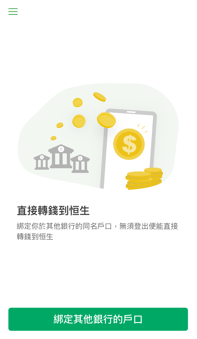 透過恒生Mobile App提供方便、流暢網上轉賬體驗,讓你將你其他銀行的本地戶口綁定至恒生,無須登出便能即時轉錢入恒生戶口。