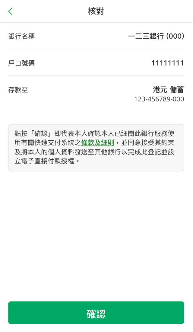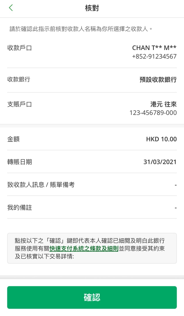 轉數快轉賬生效後,你將無法停止指示。因此透過轉數快進行轉賬時,請仔細核對收款人姓名及戶口號碼等付款詳情。