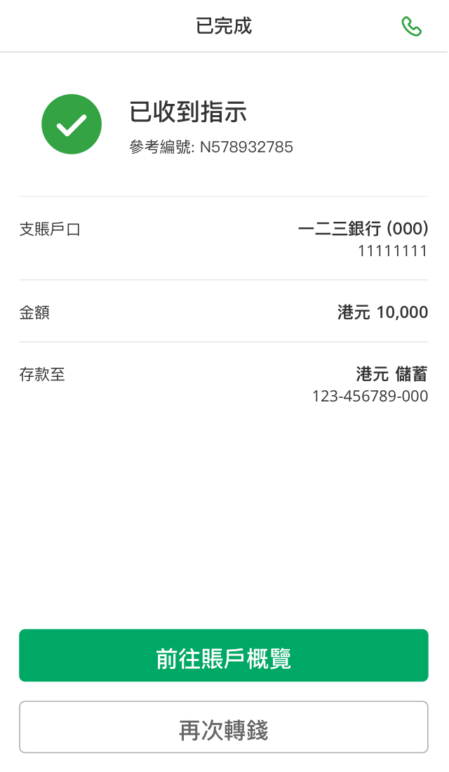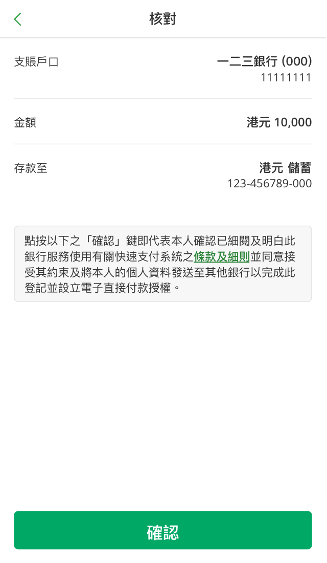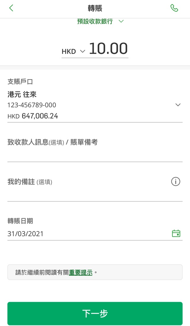 當您經「轉數快」或進行實時行內轉賬而有關金額超過港幣等值1,000或以上時,收款銀行一般會對您提供的收款人戶口號碼及名稱進行覆核。為保障您不會轉賬到錯誤的戶口,如該戶口名稱與收款銀行資料不符,有關轉賬將會被退回。請注意,其他轉賬 (例如轉賬少於港幣等值1,000),戶口名稱或不會被覆核。請小心核對收款人户口號碼及其他付款資料以確認收款人身份。轉賬一經成功執行,您或不可能終止有關轉賬交易。