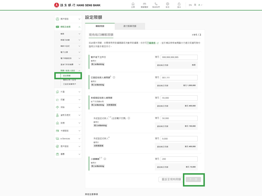 你可透過桌面版恒生個人e-Banking或恒生個人流動理財服務應用程式設立轉賬限額。詳細步驟請參考本頁之「設定轉賬限額及轉賬」示範。