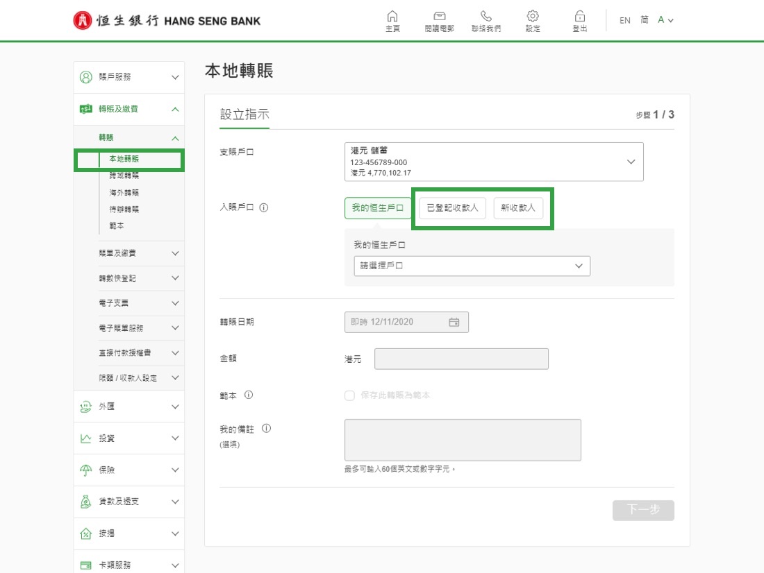 你可在登入恒生Mobile App後選擇「轉賬及付款」>「本地」分頁 >「至本地戶口/轉數快」。如要轉賬至現有的已登記收款人,請從清單選擇收款人;如要轉賬至未登記收款人,你要輸入新收款人資料,例如姓名、收款銀行及銀行戶口號碼。之後你需要填寫轉賬金額、貨幣及致收款人訊息(選填)以進行轉賬。