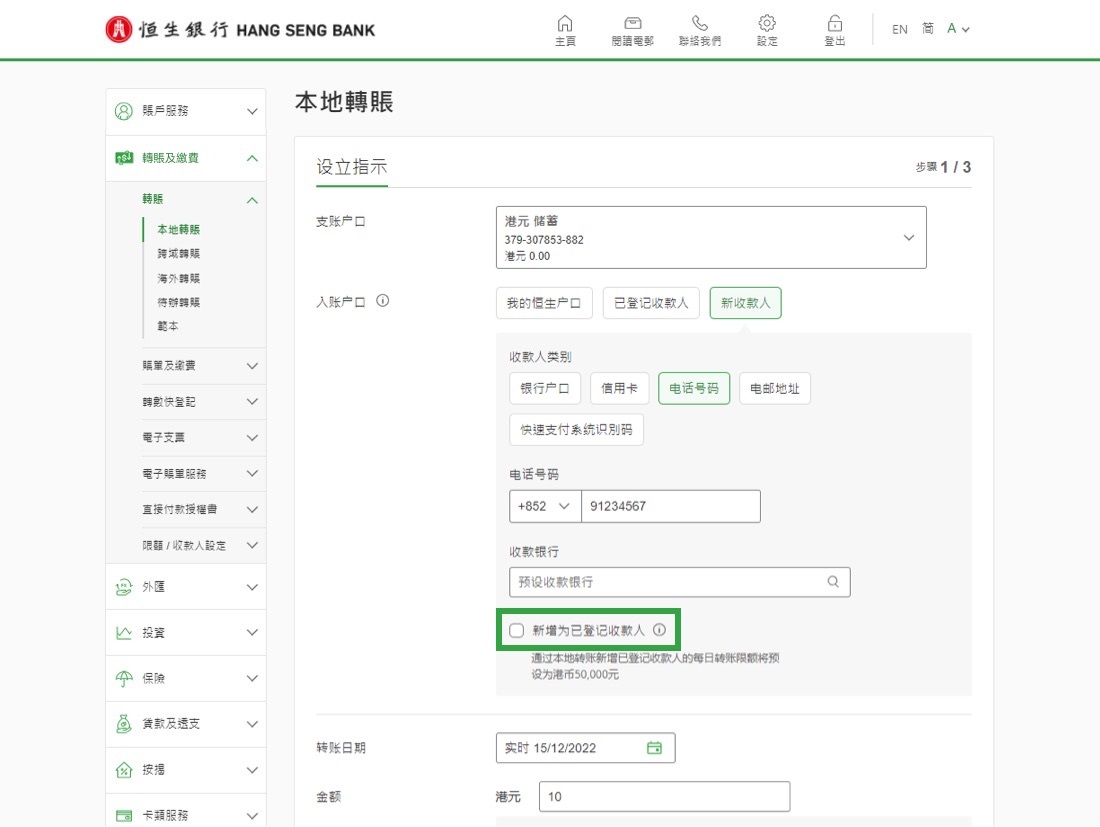 如需要轉賬至新收款人,你必須於本行登記有效的電話號碼,並已設定未經登記收款人或小額轉賬之每日轉賬限額,如使用未經登記收款人之每日轉賬限額,你亦需要先啟動保安編碼器或流動保安編碼作交易認證。如收款銀行是「轉數快」參與者之一,通常可以即時接收款項,但仍需視乎收款銀行之運行模式。