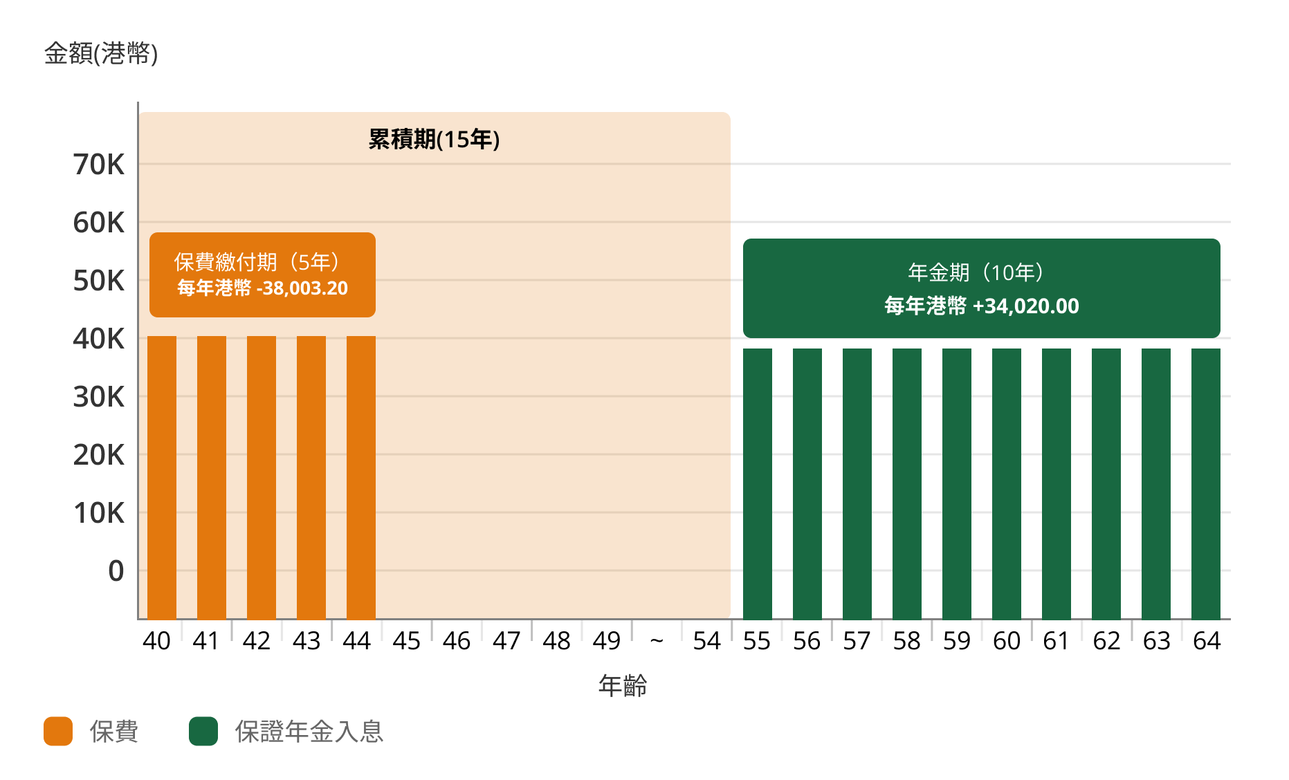 陳先生的保單累積期為15年,已繳總保費由投保開始直至他54歲期間積存生息