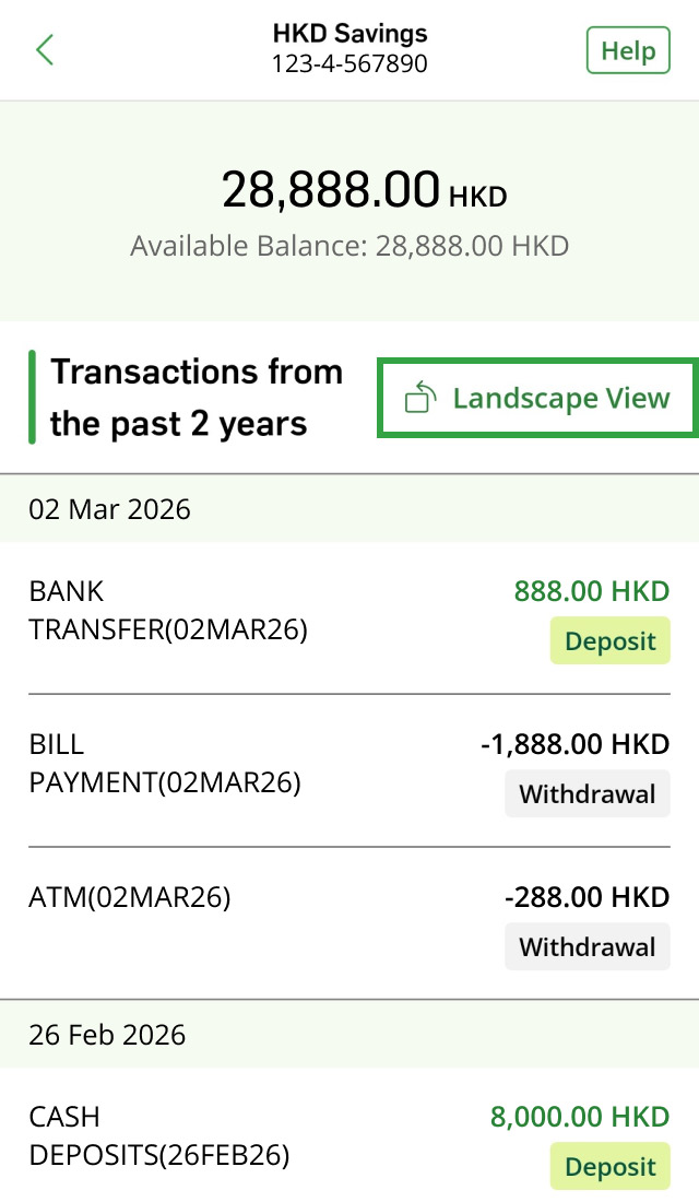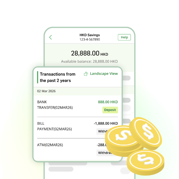 If you are a Hang Seng e-Banking customer, simply log on to the Hang Seng Mobile App to enjoy the enhanced interface. You can view your HKD Passbook Savings Account transaction records from the past 2 years and request a Savings Account History Report covering the past 7 years, including entries printed in the physical passbook and net back items.