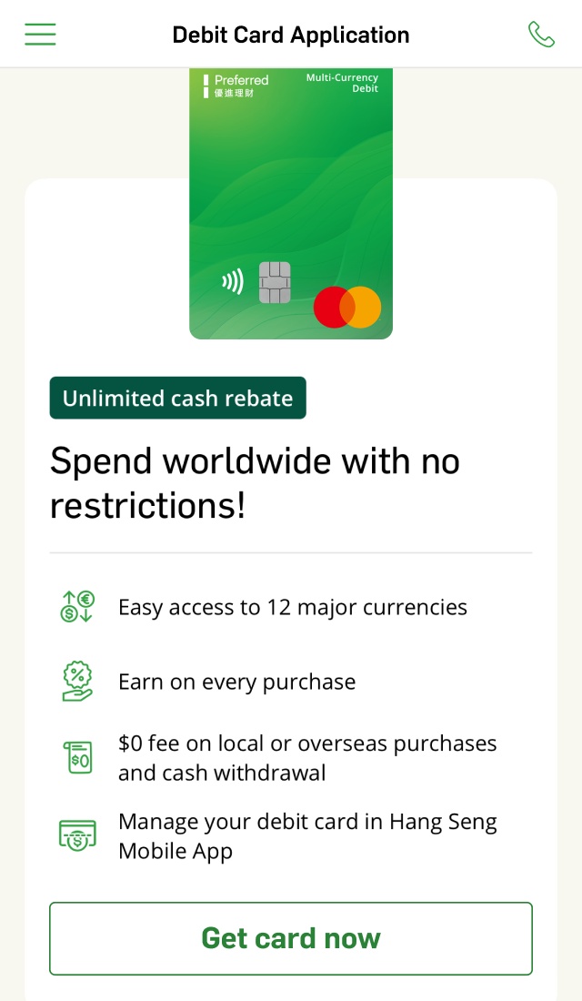 If you are aged 12 or above and have a HKID or passport, you can get a supplementary debit card even if you don't have a Hang Seng account. The primary cardholder needs to submit the request for family or friends via Hang Seng Mobile App.