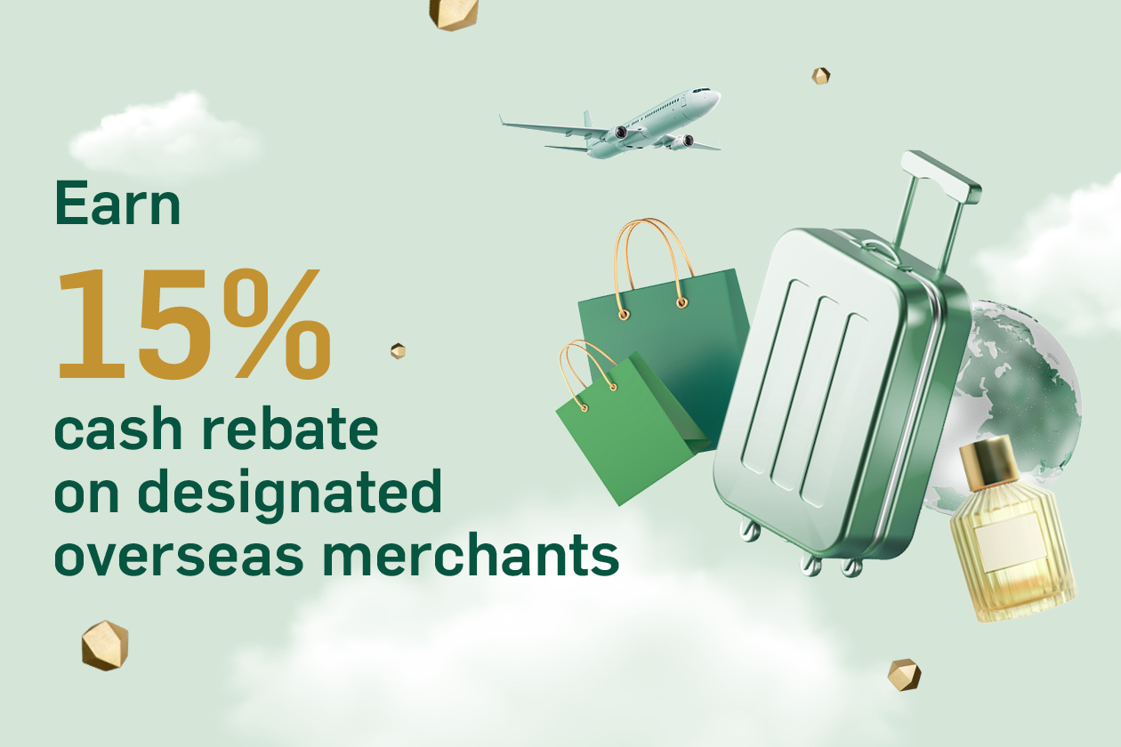 Enjoy 15% cash rebate when settling eligible transactions at below designated overseas merchants. Each customer can earn an accumulated cash rebate up to an equivalent of HKD6,600 in foreign currency per phase, and a total cash rebate up to an equivalent of HKD13,200 in foreign currency during the Promotion Period (determined by the record of the foreign currency when the transaction is made). Each customer can enjoy the cash rebate from each of the Designated Merchants once in each phase. No need to register.