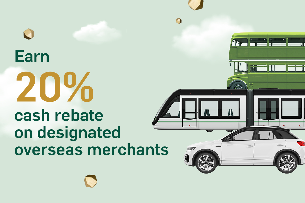 Enjoy 20% cash rebate when settling eligible transactions at below designated overseas public transportation and car rental merchants. Each customer can earn an accumulated cash rebate up to HKD150 per phase, and a total cash rebate up to HKD300 during the Promotion Period. No need to register.