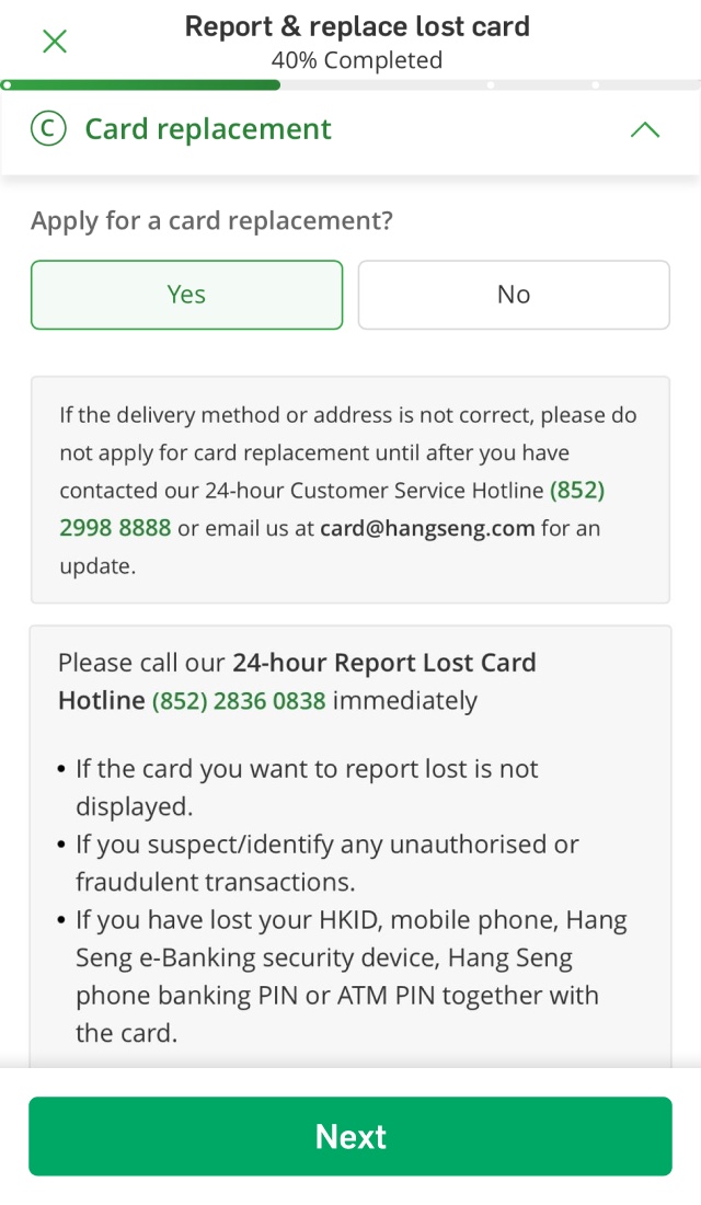 If you've lost your credit card, you can report it and request a replacement card via Hang Seng Mobile App. If you notice any unauthorised transactions, please fill in the Unauthorised Transaction Reporting Form or call the 24-hour report lost card hotline (852) 2836 0838 immediately.