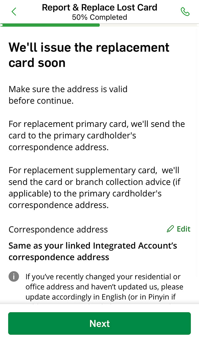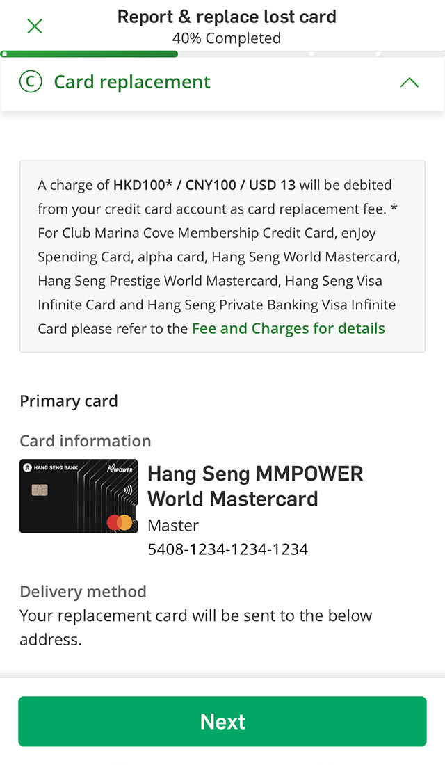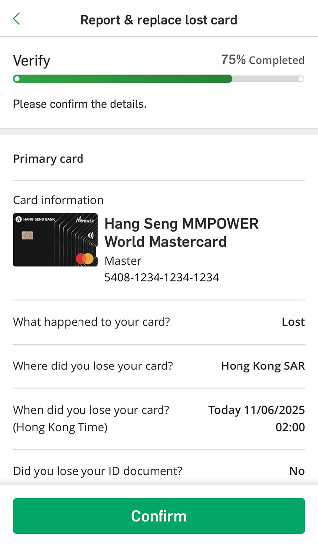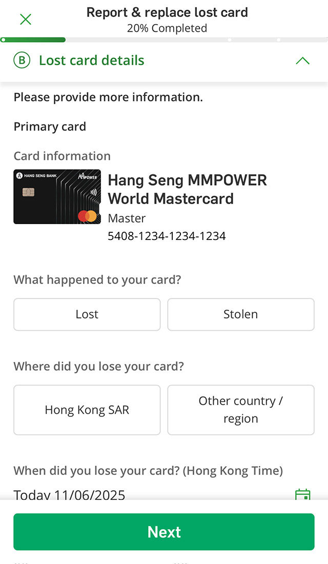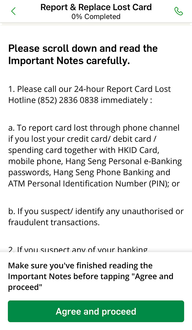 If you've lost your credit card, you can report it and request a replacement card via Hang Seng Mobile App. If you notice any unauthorised transactions, please fill in the Unauthorised Transaction Reporting Form or call the 24-hour report lost card hotline (852) 2836 0838 immediately.