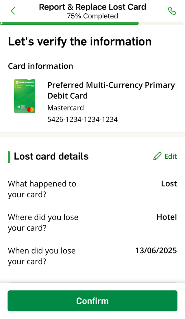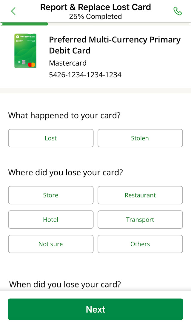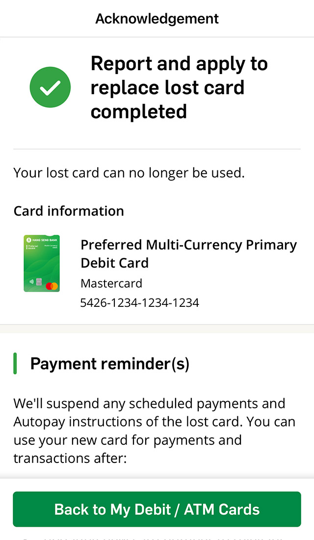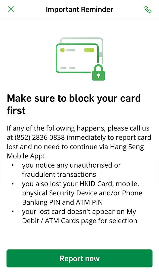 If you've lost your debit card, you can report it and request a replacement card via Hang Seng Mobile App. If you notice any unauthorised transactions, please fill in the Unauthorised Transaction Reporting Form or call the 24-hour report lost card hotline (852) 2836 0838 immediately.