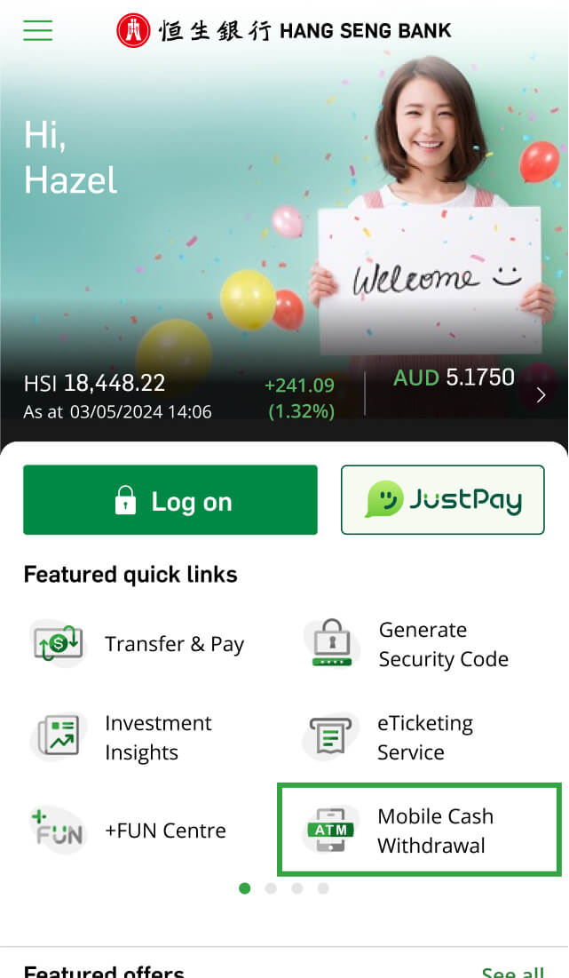 Hang Seng Mobile Cash Withdrawal service via Hang Seng Personal Banking mobile app is provided to Hang Seng customers. Hang Seng customers place a mobile cash withdrawal instruction on Hang Seng Personal Banking mobile app and collect the cash from Hang Seng or HSBC Automated Teller Machines (ATM) or Multi-Function ATM (MFM) by tapping their mobile phone on the Near-Field Communication (NFC) device (applicable to Hang Seng ATM and MFM only) or scanning a QR code, instead of using ATM card.