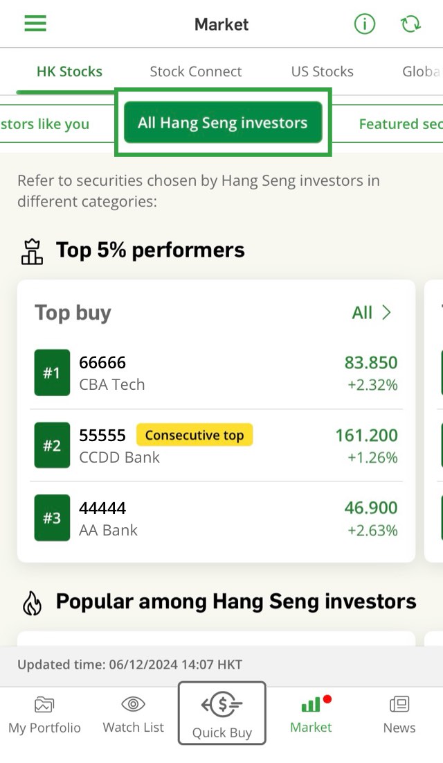 From Hang Seng's big data, explore popular stock picks from "Investors Like You", top performers and all investors to discover investment opportunities.