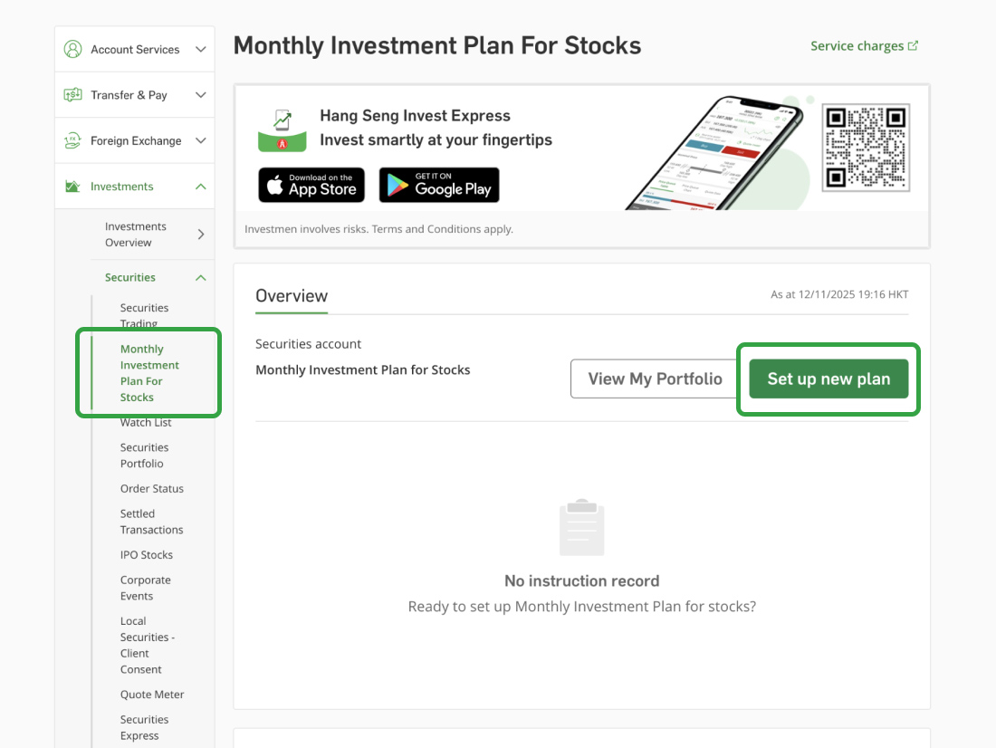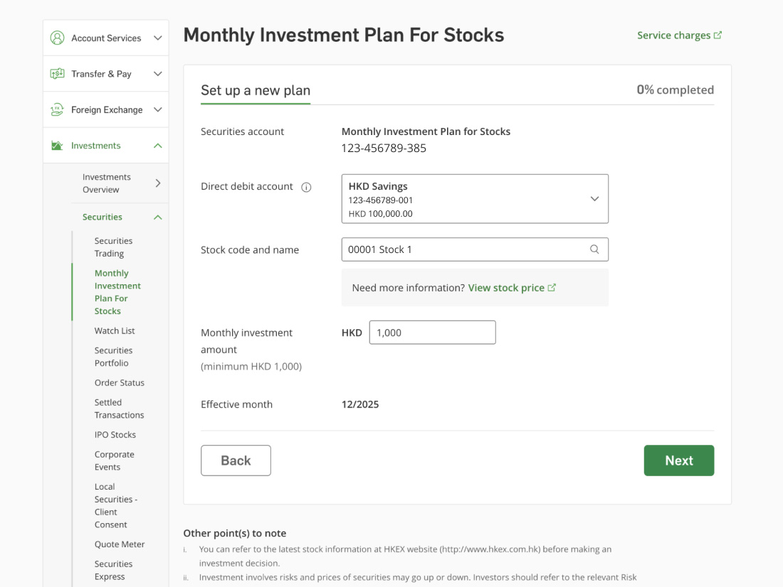 Sole-named Integrated Account holders can open an account for Monthly Investment Plan for Stocks and set up a new plan via Personal e-Banking. The new plan will be effective from the next calendar month following the month you set up the new plan, with the 1st payment date scheduled for the 10th of such following calendar month. If the 10th falls on a Saturday, Sunday or public holiday, the payment will occur on the next trading day.