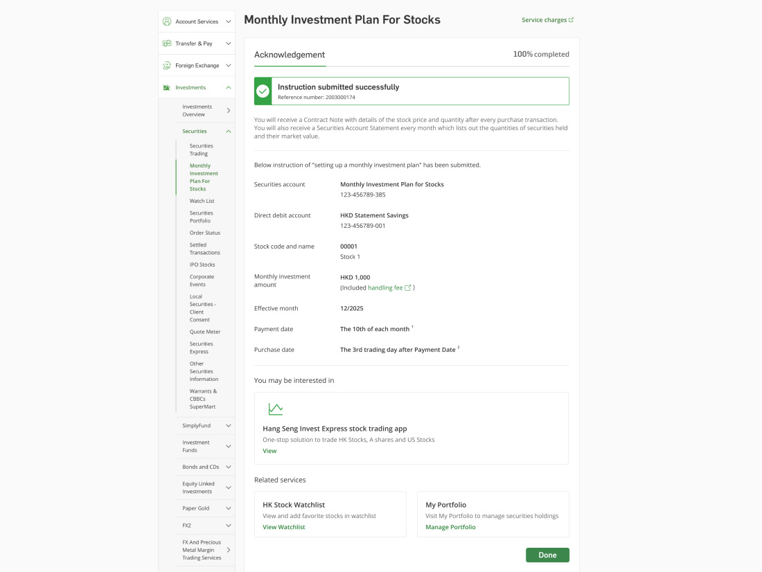 You can check pending instruction details via Personal e-Banking "Monthly Investment Plan" > "Pending Instruction", where you can also amend or cancel pending instructions. Amendments will take effect in the next calendar month while cancellation will be effective immediately.