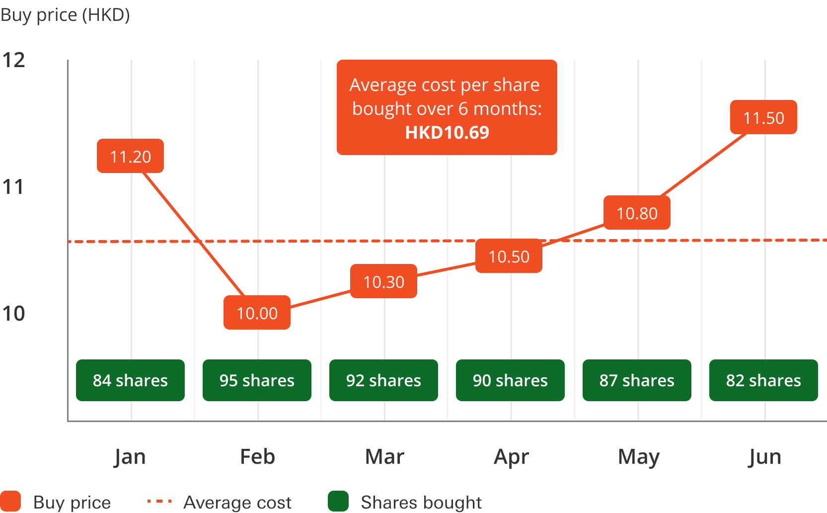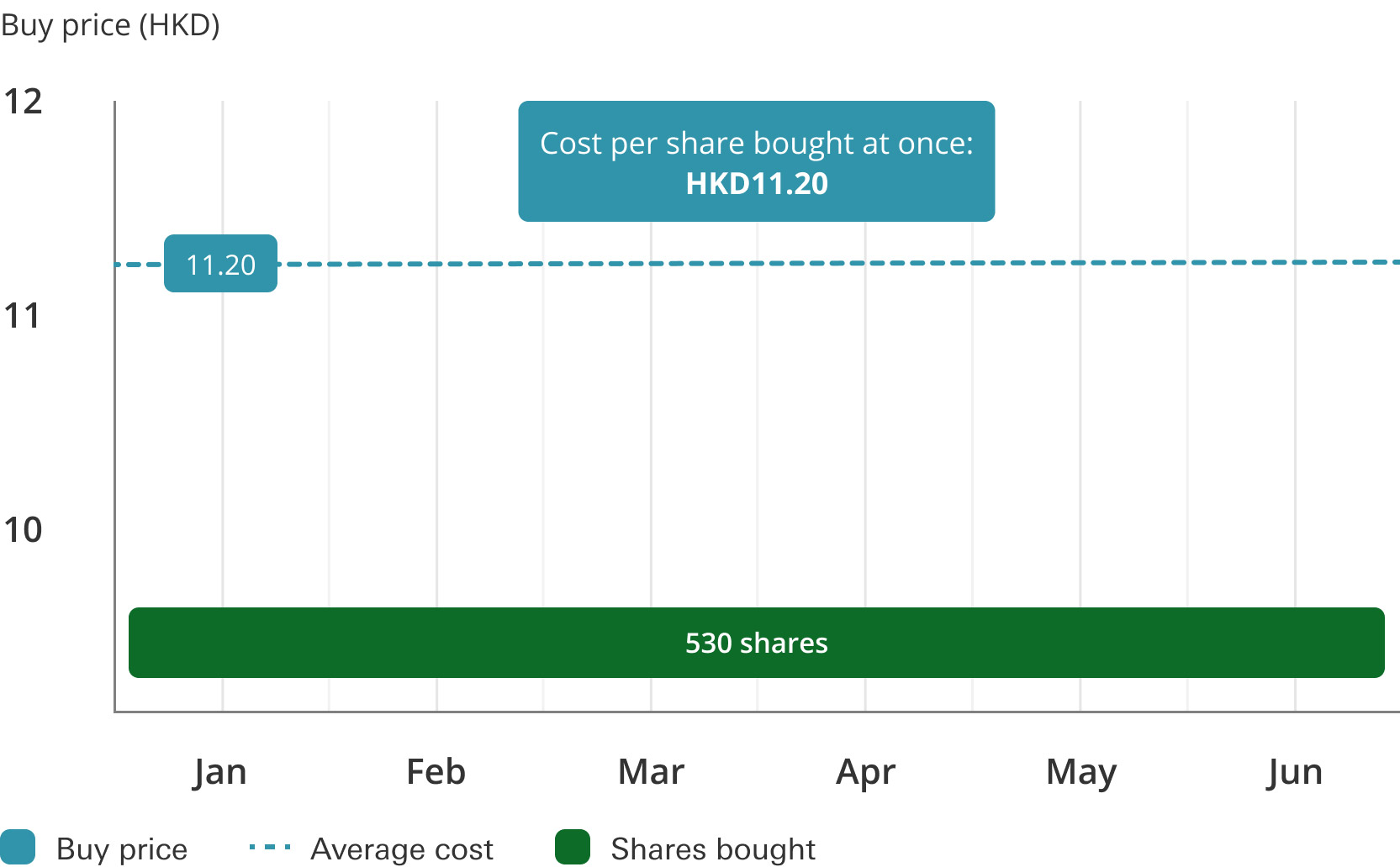 With Monthly Investment Plan, Tom invested a total of HKD5,666 over 6 months, buying 530 shares at an average cost of HKD10.69 per share. Compared to buying all shares at once at HKD11.20 per share in the 1st month, he saved HKD370 on investment costs (HKD6,036 - HKD5,666).[1]