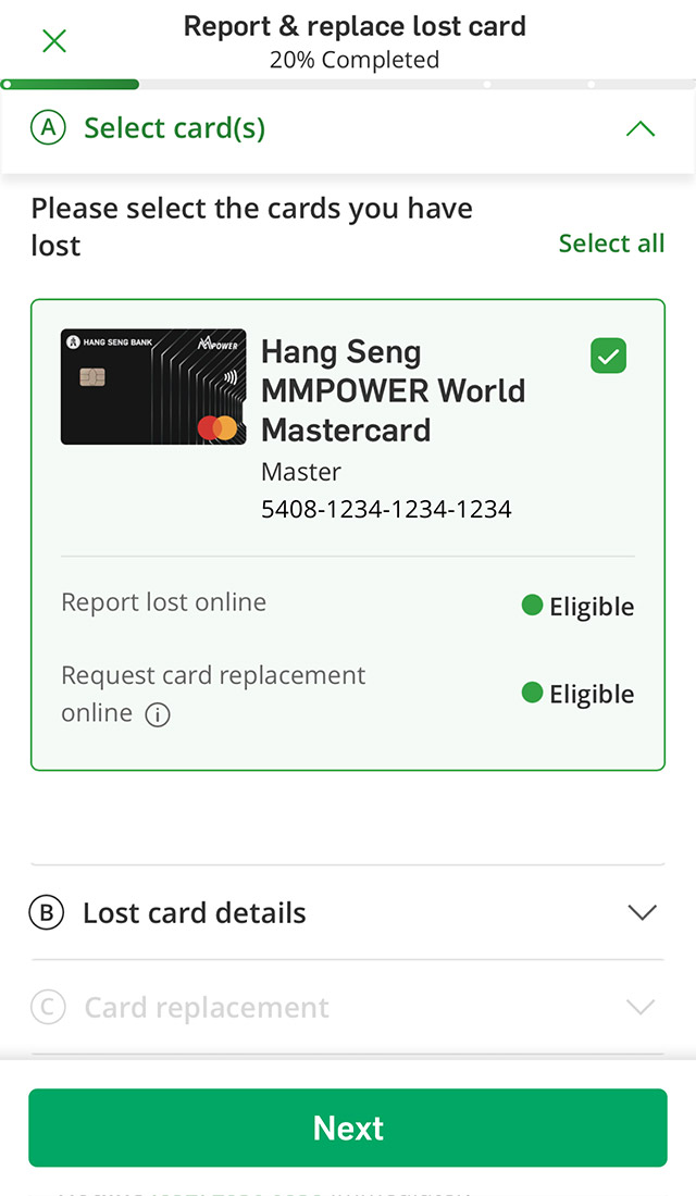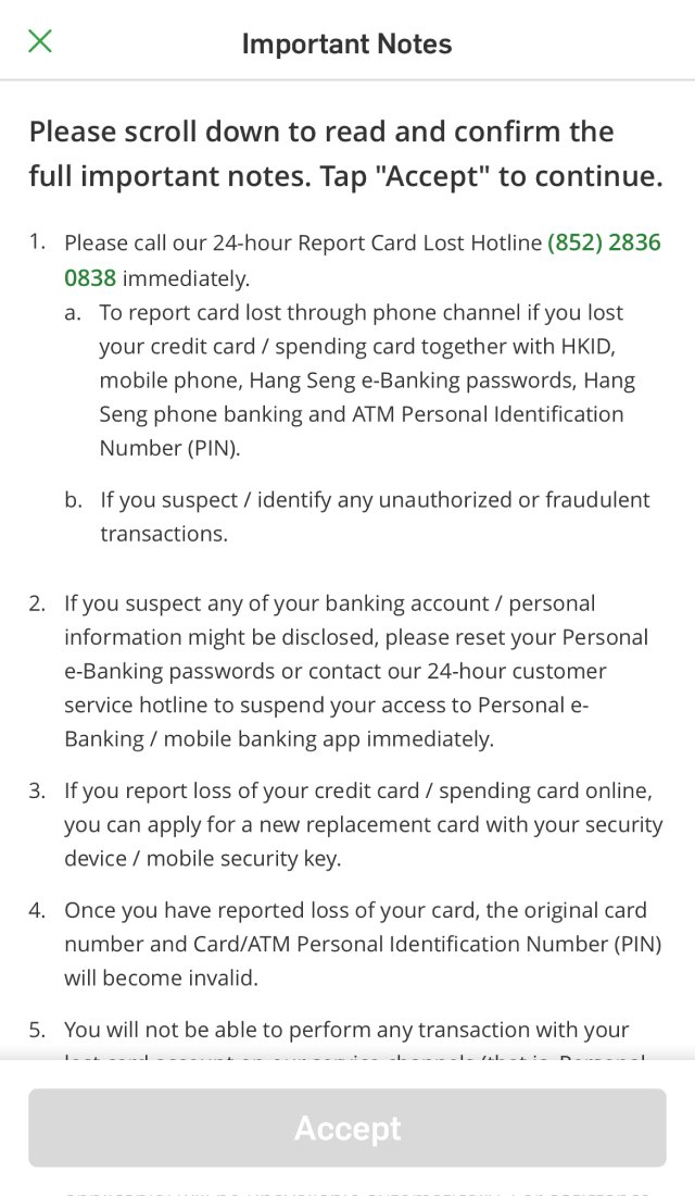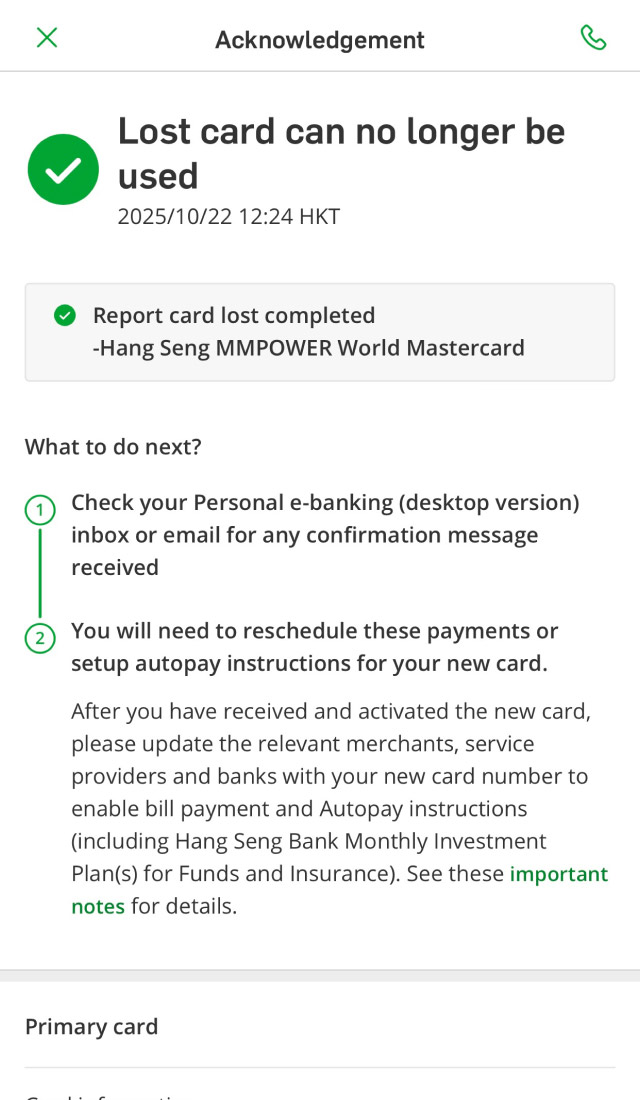 If you've lost your credit card, you can report it and request a replacement card via Hang Seng Mobile App or call the 24-hour report lost card hotline (852) 2836 0838 immediately. If you notice any unauthorised transactions, please fill in the Unauthorised Transaction Reporting Form.