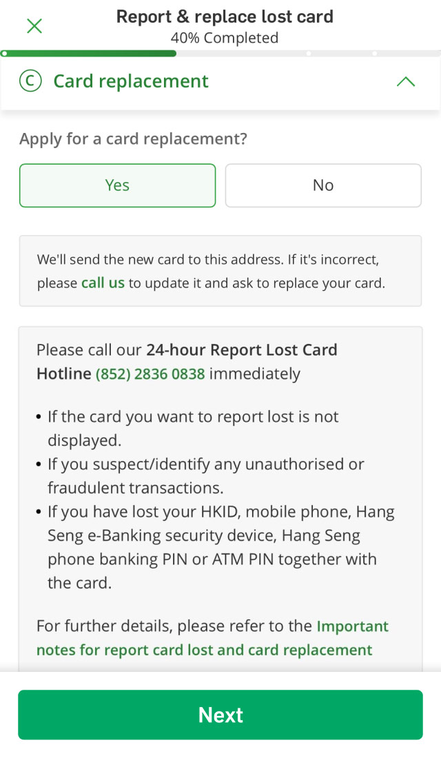 If you've lost your debit card, you can report it and request a replacement card via Hang Seng Mobile App or call the 24-hour report lost card hotline (852) 2836 0838 immediately. If you notice any unauthorised transactions, please fill in the Unauthorised Transaction Reporting Form.