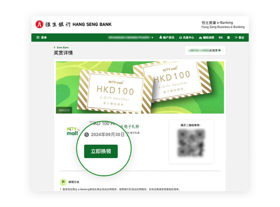 完成不同任务后,可在线上或前往实体换领点换领奖赏。使用恒生商业流动应用程序,换领更省时方便。