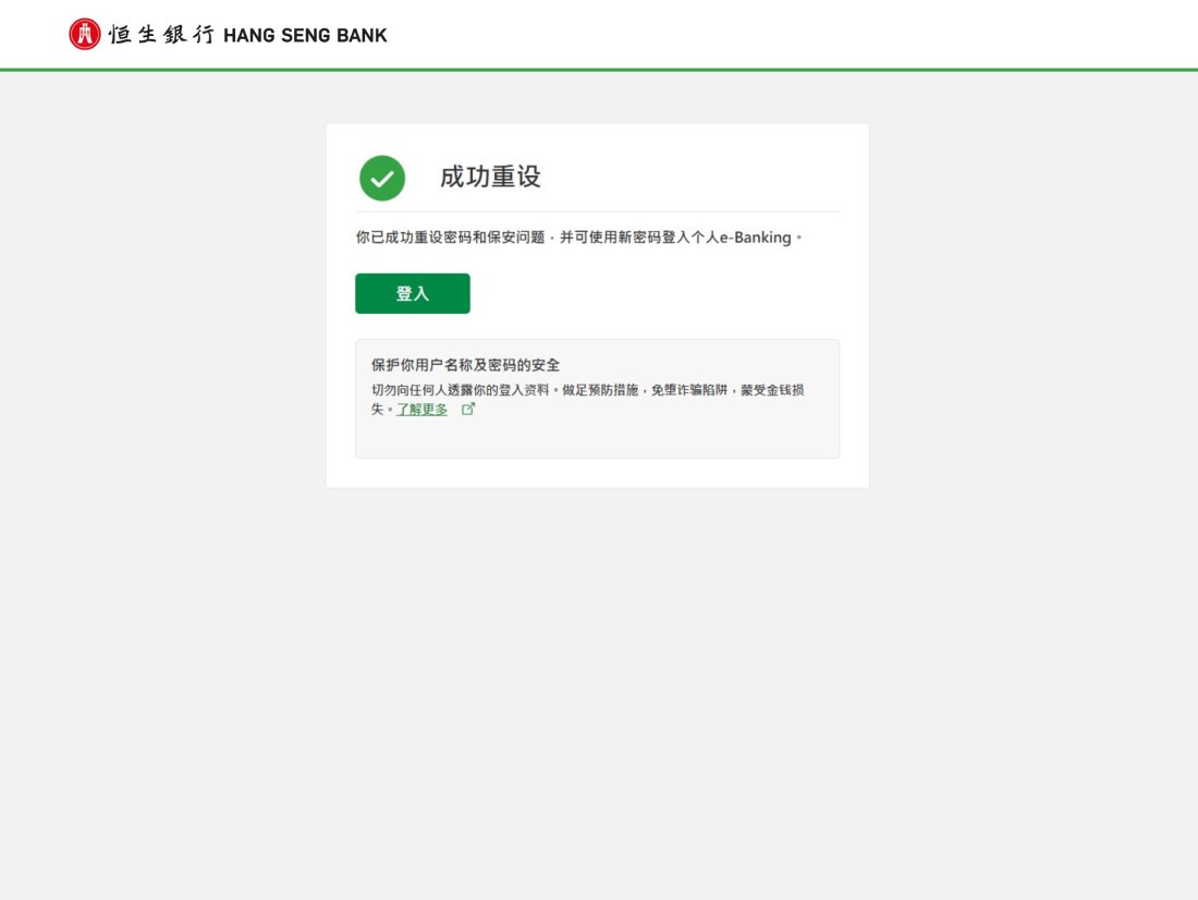 请前往个人e-Banking登入页面并输入你的用户名称,然后点击“继续” > “忘记密码”,你可选择最适合你的方式并根据指示重置密码。请到此页的“如何运作?”部分查看详情。