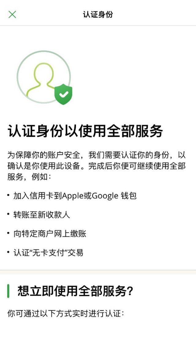 为进一步保障你的账户安全,当你在新设备上成功绑定及启动流动保安编码后,部分服务有可能会被暂时停用。 如需恢复服务,你需要进一步认证你的身份以使用所有恒生Mobile App和个人e-Banking服务: