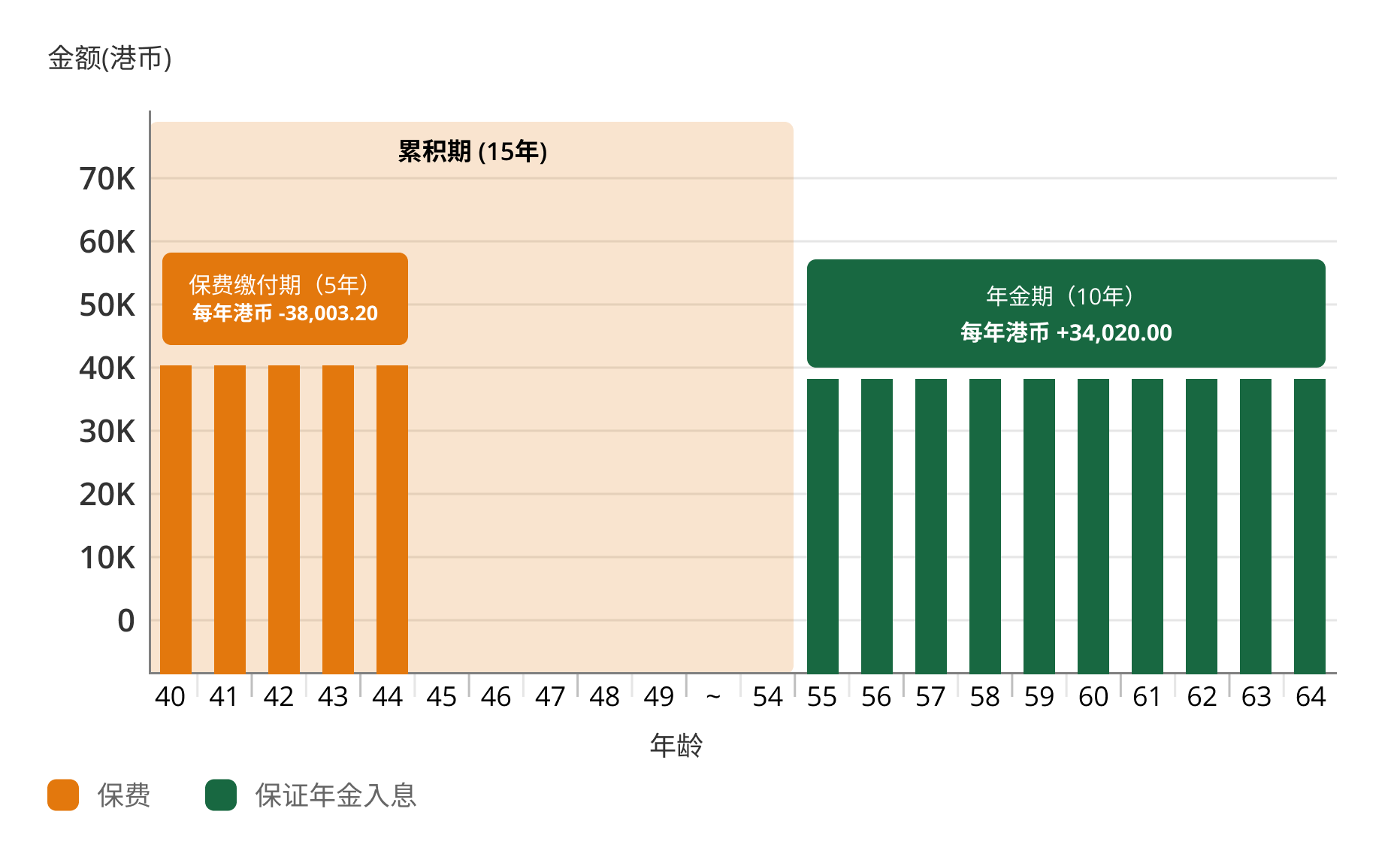 陈先生的保单累积期为15年,已缴总保费由投保开始直至他54岁期间积存生息