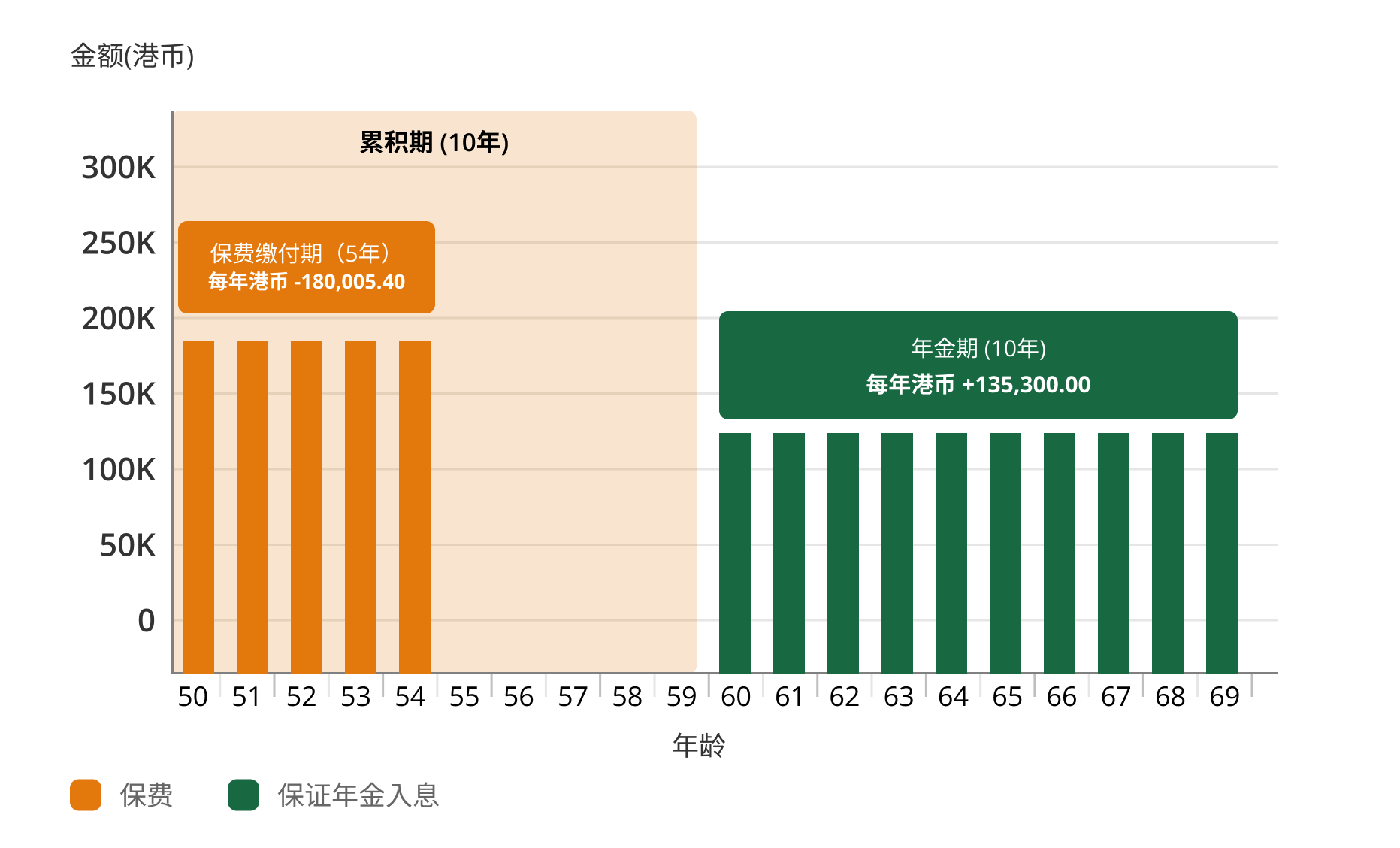 陈先生的保单进入10年年金期,他将收取每年港币135,300.00的保证年金入息