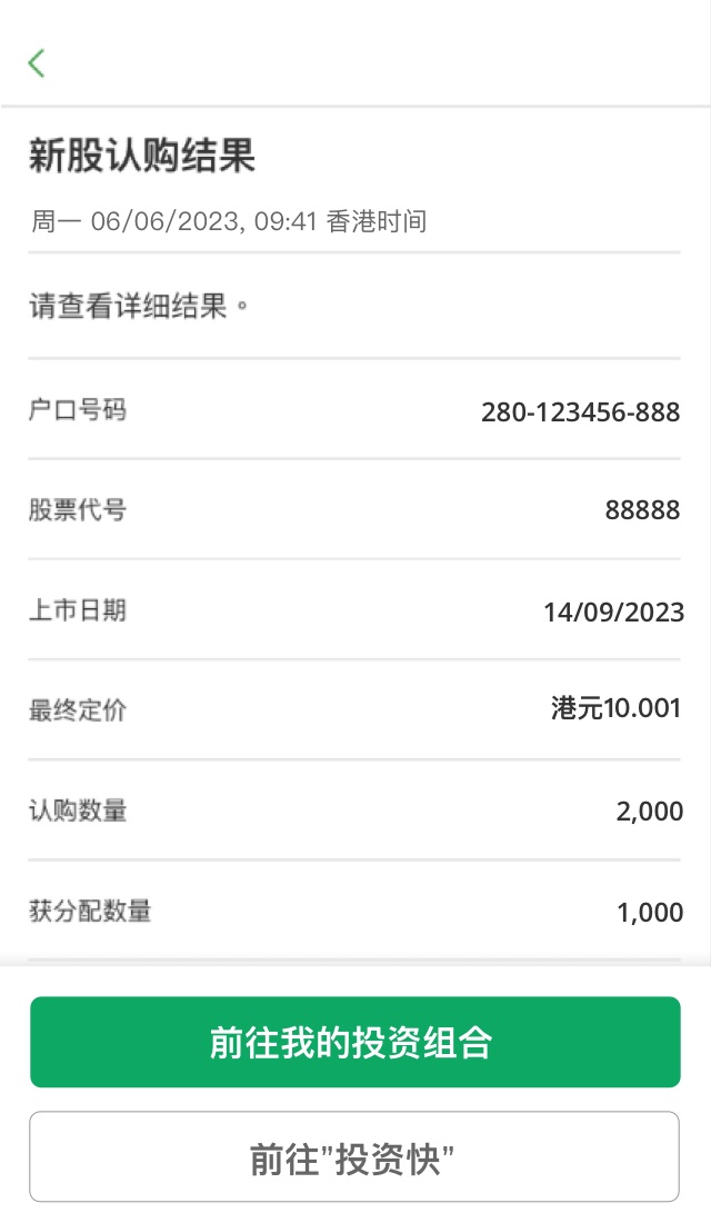 在新股上市前一天,你会经短信或已开启的推送通知收到认购结果,掌握最新认购状况。