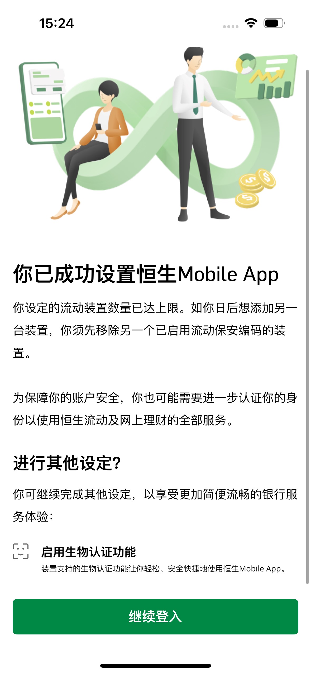如需恢复服务,你需要先前往恒生Mobile App内的"设定及安全" > "设备及应用程序设置"认证身份以享有全面的个人e-Banking服务。