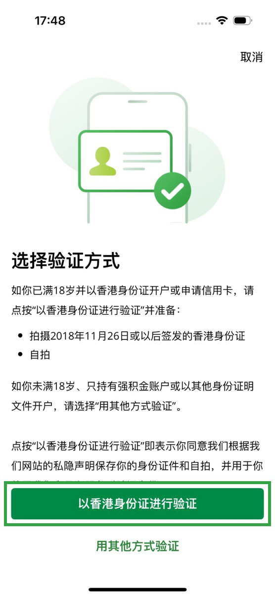 如你只持有强积金账户,或使用其他身份证明文件开户,你可在下载恒生Mobile App后选择以其他方式验证身份及登记个人e-Banking。