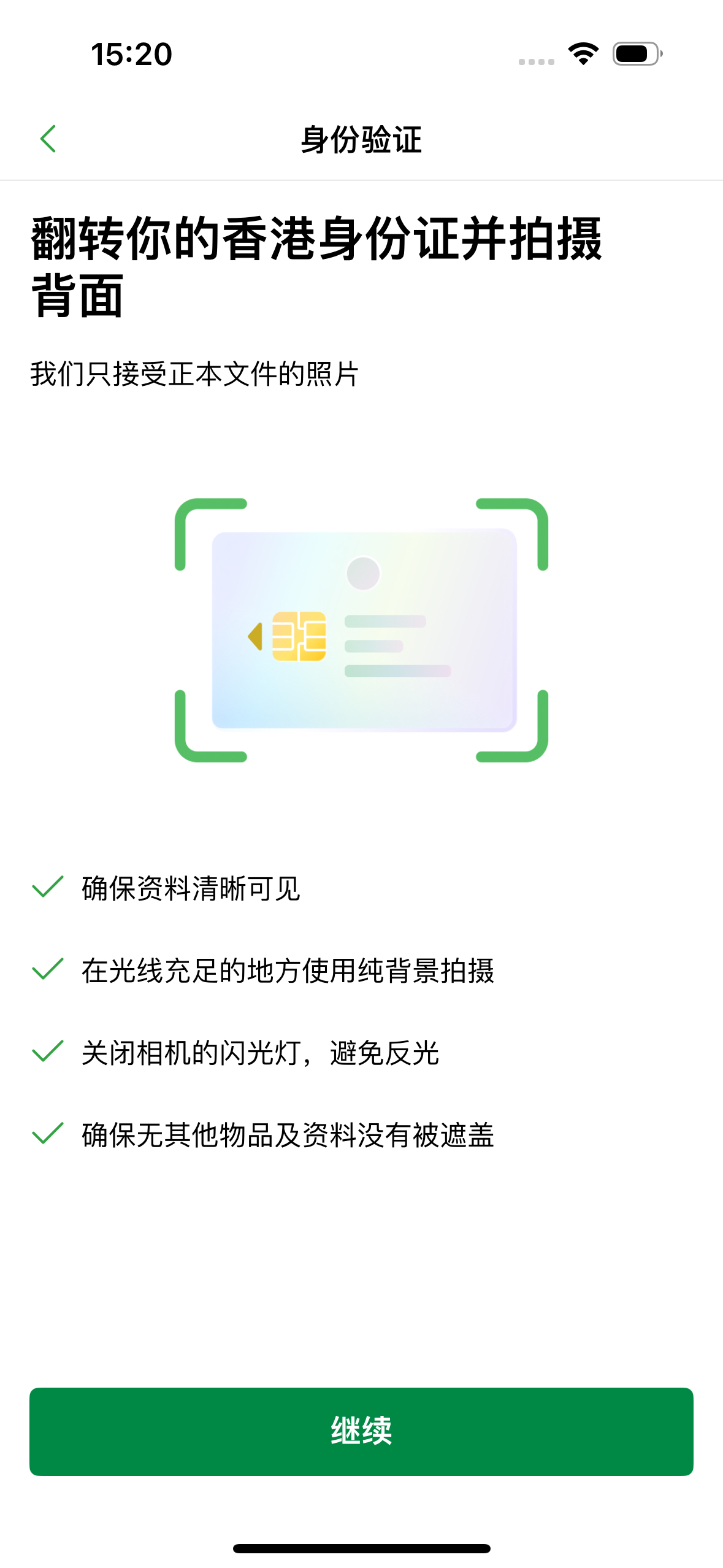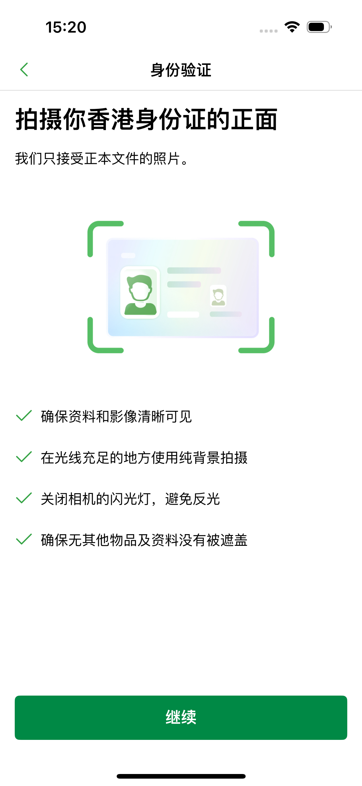 请确保你持有仍活跃的银行/信用卡账户及使用香港身份证开户,而且拍摄的香港身份证照片及自拍照清晰可见。 请注意,只有强积金户口的用户并不能使用香港身份证登记个人e-Banking及启动流动保安编码。如果失败次数超出上限,你可以在稍后重试,或前往分行验证身份。