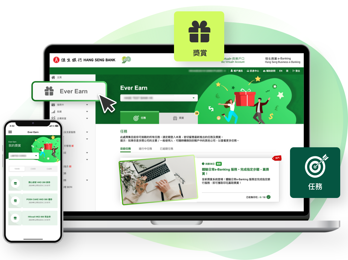 Ever Earn 任務讓你透過在恒生商業 e-Banking處理日常理財,賺取豐富獎賞。請即查看最新推出之任務。