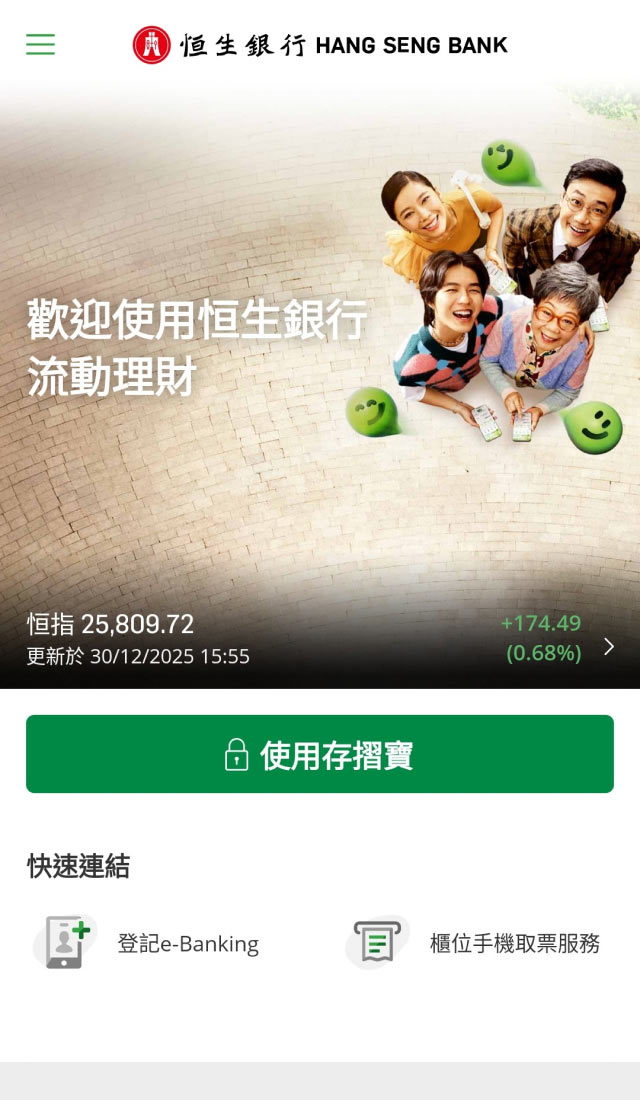 「存摺寶」及恒生Mobile App的實際表現會因個別裝置而異。恒生Mobile App在讀取「存摺寶」時可能受軟件/韌體版本、NFC偵測區域、作業系統設定、操作環境及網絡連接等因素所影響。