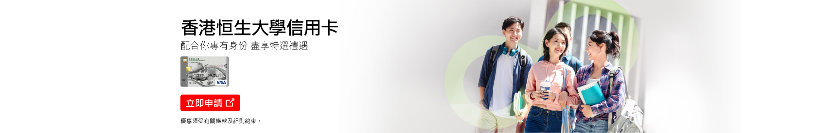 成功申請大學/大專聯營信用卡,即可盡享連串精彩迎新優惠。