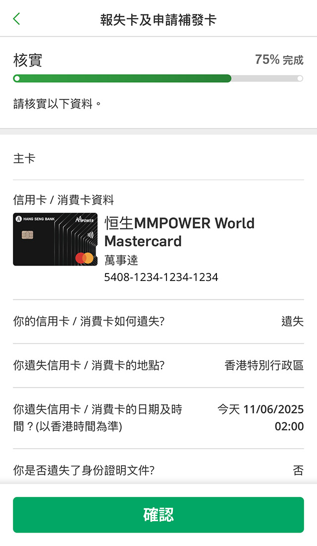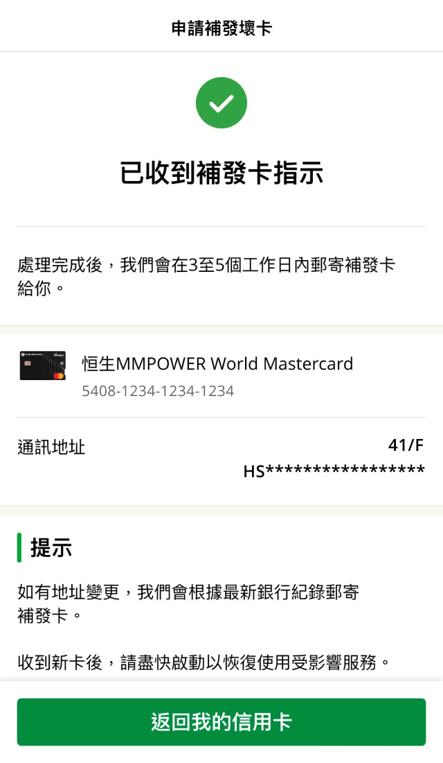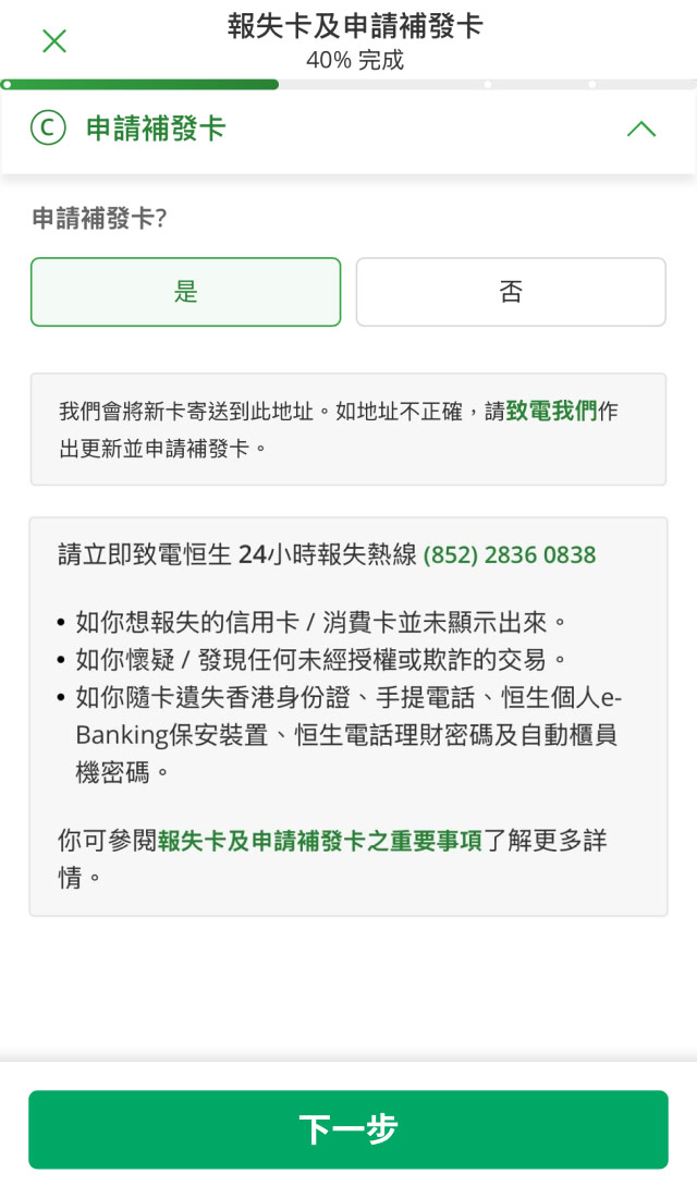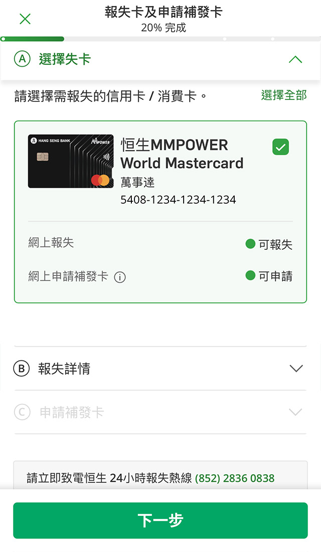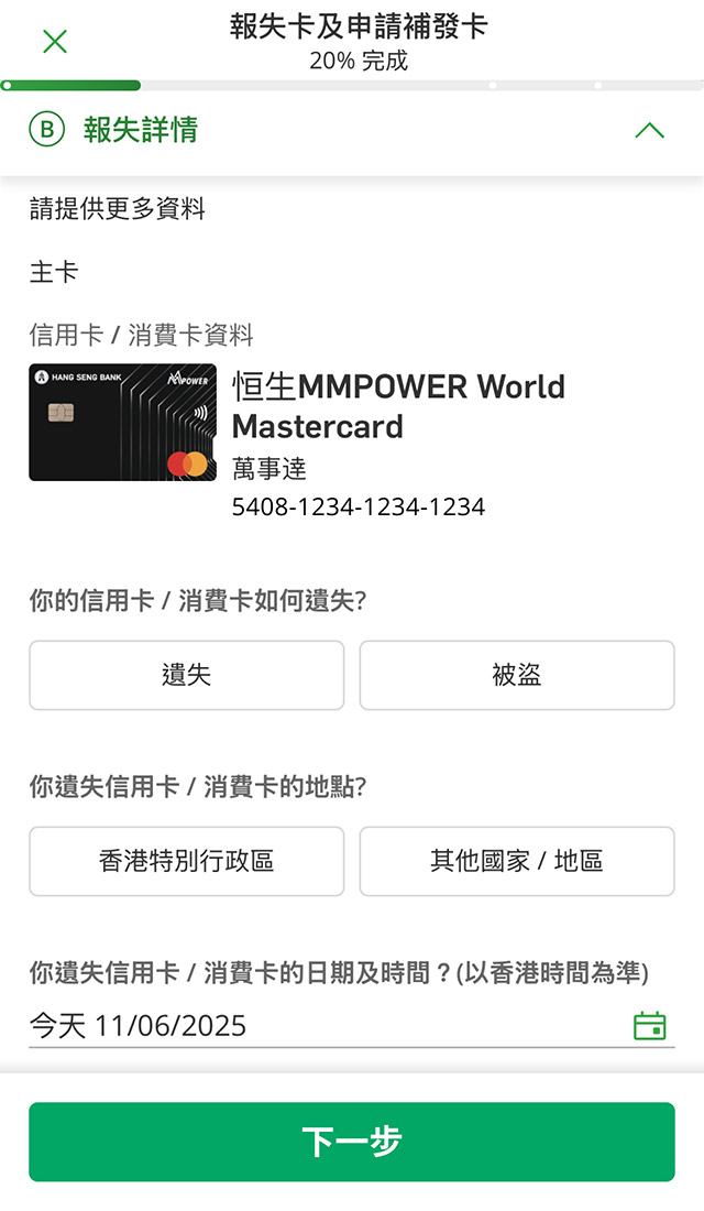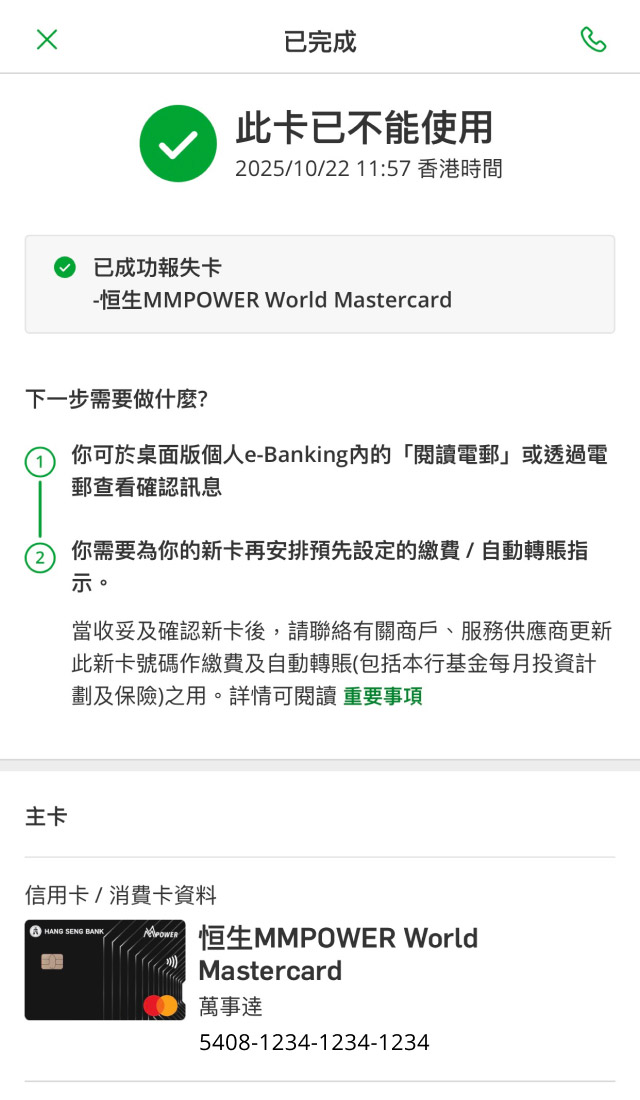 如果你遺失了信用卡,你可以透過恒生Mobile App或致電24小時報失卡熱線(852) 2836 0838報失及申請補發卡;如發現信用卡有任何未經授權的交易,請立即填妥未經授權交易申報表格。