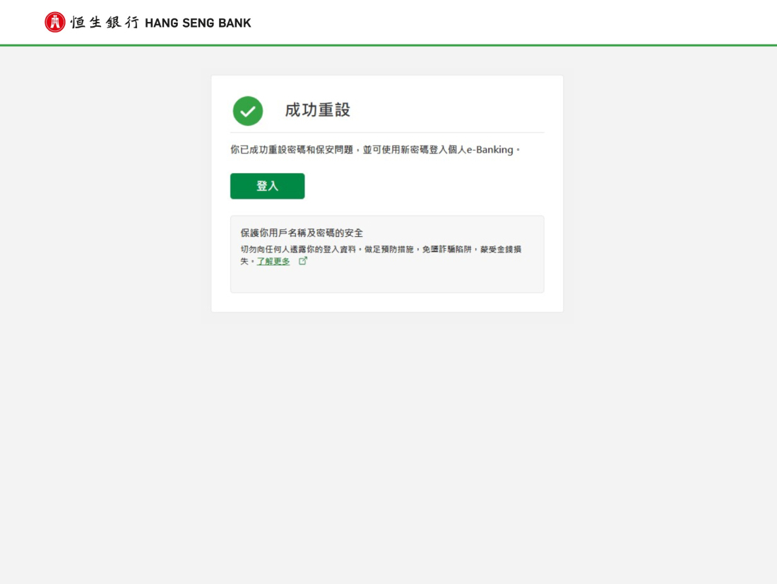 如忘記密碼,你可在個人e-Banking登入頁面點擊「忘記密碼」,然後根據此頁「如何運作」部分下的「重設密碼」步驟設定新密碼。