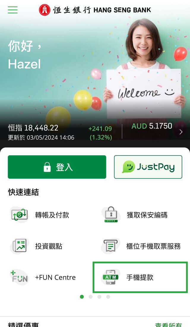 恒生現為本行客戶提供恒生個人流動理財手機提款服務。恒生客戶透過恒生個人流動理財服務應用程式發出手機提款指示後,並在恒生或滙豐自動櫃員機或多功能自動櫃員機上以手機輕觸近距離無線通訊(NFC)讀取器(只適用於恒生自動櫃員機及多功能自動櫃員機)或以手機掃描二維碼QR code便可提取所需現金,無需使用卡提款。