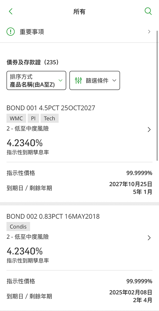 我們將根據您的要求顯示於「跨境理財通 - 南向通」計劃下合資格的債券/ 存款證產品列表。該列表僅提供公開及一般資料和作為參考之用,並非亦不應被視為招攬、推介或就任何投資服務或投資產品提供意見或作出要約。投資者須注意,所有投資涉及風險 (包括可能會損失投資本金的風險),債券 / 存款證價格可升亦可跌,過往表現未必可作為日後表現的指引。投資者不應只根據本資訊而作出任何投資決定。因此,於作出任何投資決定前,投資者應小心閱讀債券/ 存款證的銷售文件 (包括各項風險因素之全文) 及風險披露文件。投資者也應仔細考慮自己的投資目標、投資經驗、投資年期、財政狀況、風險承受能力、稅務後果及特定需要,以決定該投資是否適合其本身,亦應了解投資產品的性質、條款及風險。投資者如對其投資有任何疑問,請諮詢獨立的專業意見。